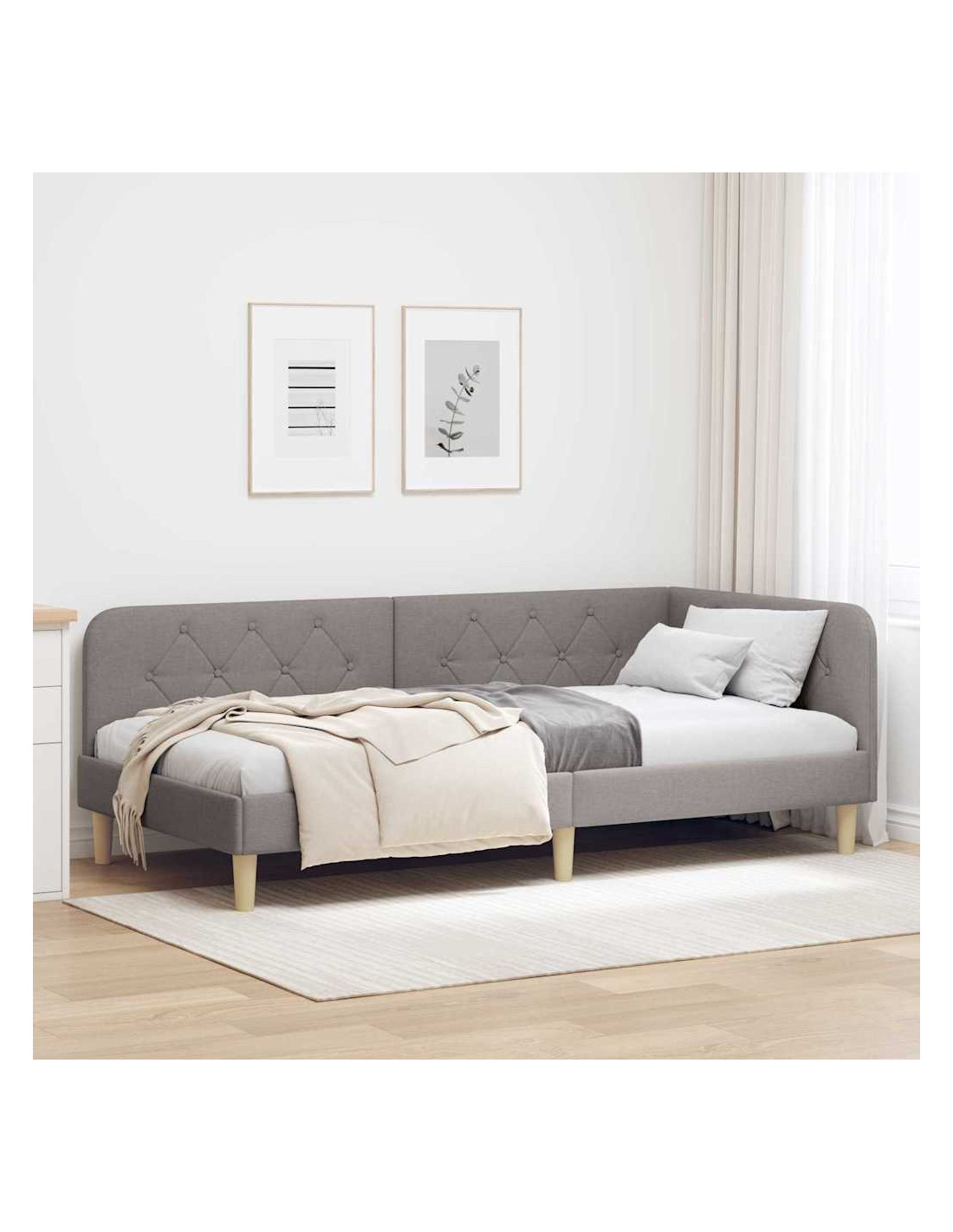 Questo telaio del letto angolare in tessuto è un letto giorno moderno pensato per il relax e il sonno. La struttura a L è ideale per qualsiasi angolo della camera e può essere usata come divano o letto. Perfetto per chi ama la praticità senza rinunciare all'estetica, offre un tocco contemporaneo adatto a varie disposizioni.