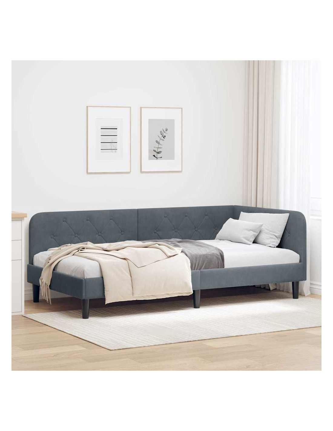 Questa struttura per letto giorno è la soluzione ideale per camere che hanno bisogno di qualcosa di versatile e salvaspazio. Con il suo rivestimento in velluto che dà un tocco di eleganza e il design a forma di L, funziona sia da divano che da letto, perfetta per appartamenti oppure per stanze degli ospiti. Le linee semplici e il design minimalista la rendono moderna e in equilibrio tra funzionalità e stile.