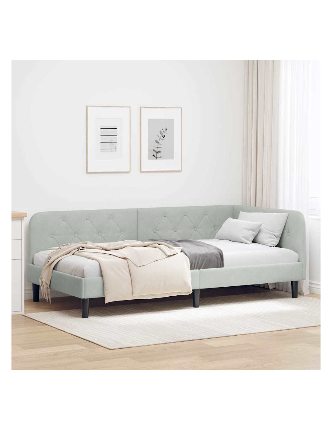 Questa struttura per letto giorno è la soluzione ideale per camere che hanno bisogno di qualcosa di versatile e salvaspazio. Con il suo rivestimento in velluto che dà un tocco di eleganza e il design a forma di L, funziona sia da divano che da letto, perfetta per appartamenti oppure per stanze degli ospiti. Le linee semplici e il design minimalista la rendono moderna e in equilibrio tra funzionalità e stile.