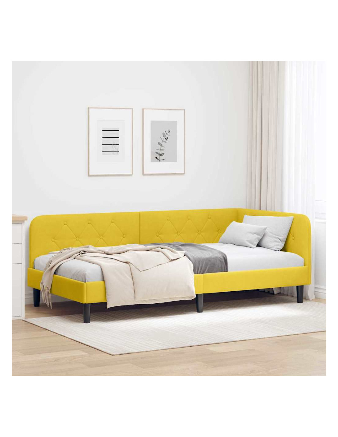 Questa struttura per letto giorno è la soluzione ideale per camere che hanno bisogno di qualcosa di versatile e salvaspazio. Con il suo rivestimento in velluto che dà un tocco di eleganza e il design a forma di L, funziona sia da divano che da letto, perfetta per appartamenti oppure per stanze degli ospiti. Le linee semplici e il design minimalista la rendono moderna e in equilibrio tra funzionalità e stile.