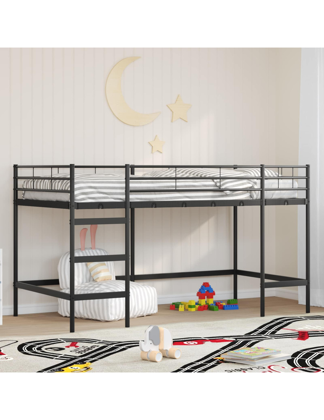 Il telaio letto a castello per bambini è un'aggiunta moderna e funzionale a qualsiasi cameretta, con un design elegante, linee pulite e decorazioni minimali. Fatto principalmente in acciaio robusto, ha una finitura opaca che evidenzia il suo fascino semplice e raffinato. Pensato per l'uso interno, il design loft solleva il letto, lasciando spazio sotto per altri mobili o aree di gioco, quindi è perfetto per case moderne con stanze piccole.