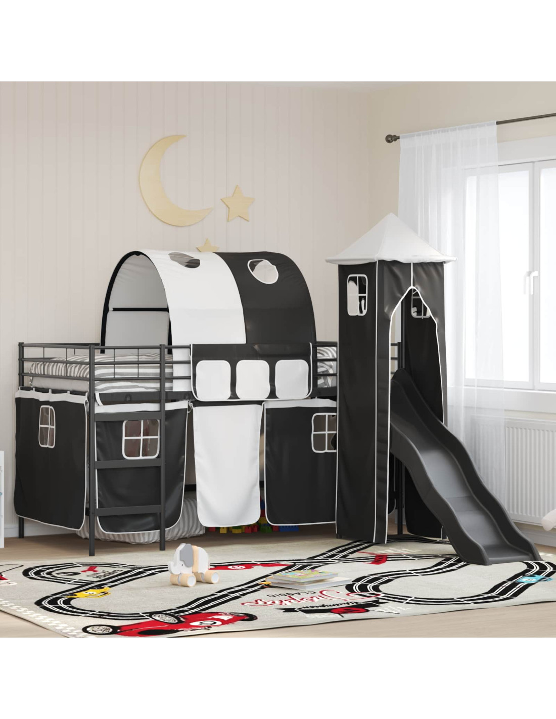 Il letto loft moderno per bambini offre uno spazio ideale per riposare e giocare. Ha un design intelligente con tende, un arco, uno scivolo e una torre per ispirare creatività e divertimento. Lo stile contemporaneo trasforma una camera normale in uno spazio multifunzionale, bello e pratico sia per dormire che per giocare. È la soluzione perfetta per rendere la stanza del tuo bambino giocosa e organizzata, con un telaio in metallo resistente di colore nero e belle tende blu e nere che aggiungono vivacità e privacy.