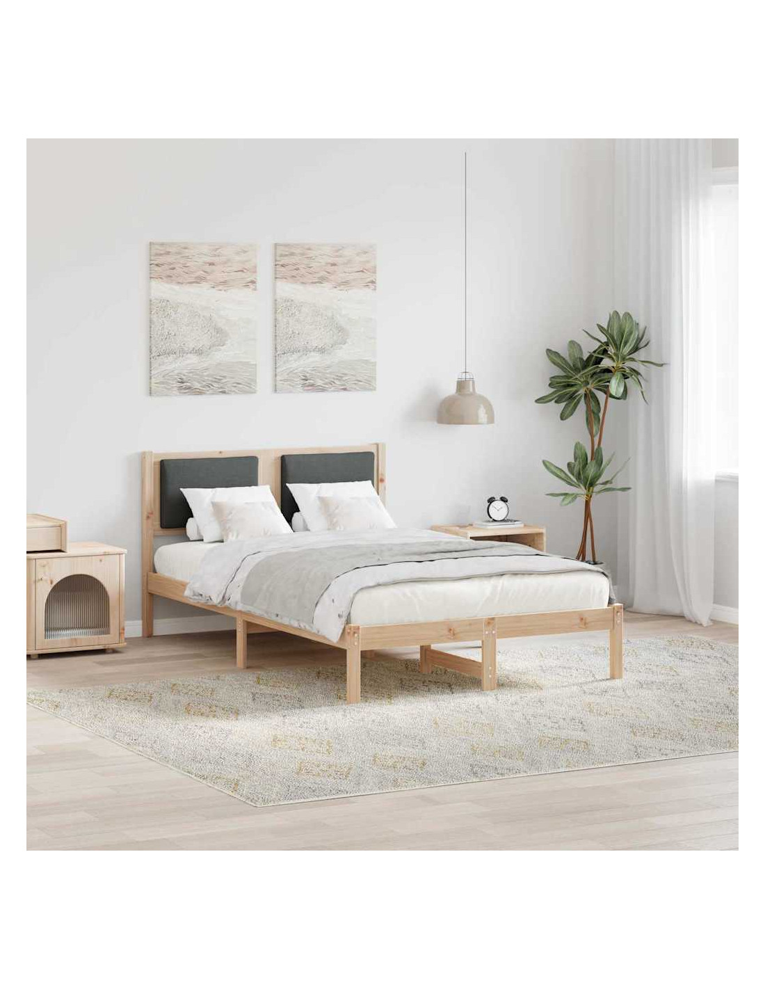 - Struttura in Legno Massello di Pino Questo letto è fatto di legno massello di pino di alta qualità e offre stabilità e durata, resistendo all'uso quotidiano. La texture naturale dei materiali aggiunge un tocco accogliente e bello alla tua camera.