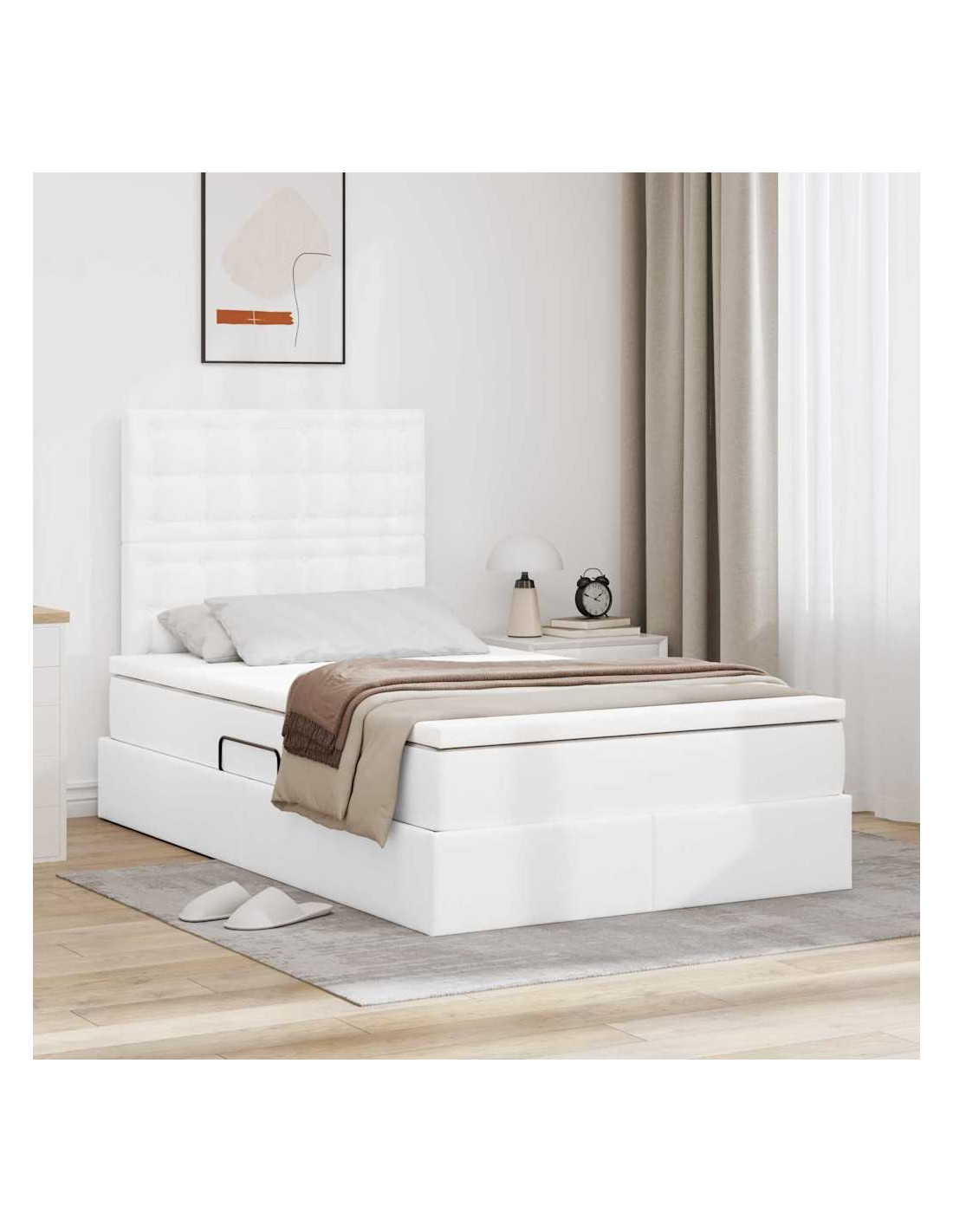 - Rivestimento in pelle sintetica: Questo letto è coperto in pelle sintetica di alta qualità, assicurando un aspetto e una sensazione di lusso. Questo materiale è scelto per la sua eleganza e durata, dando un aspetto classy senza i problemi della vera pelle. Facile da pulire e resistente, è l'ideale per chi cerca uno stile chic e low maintenance.