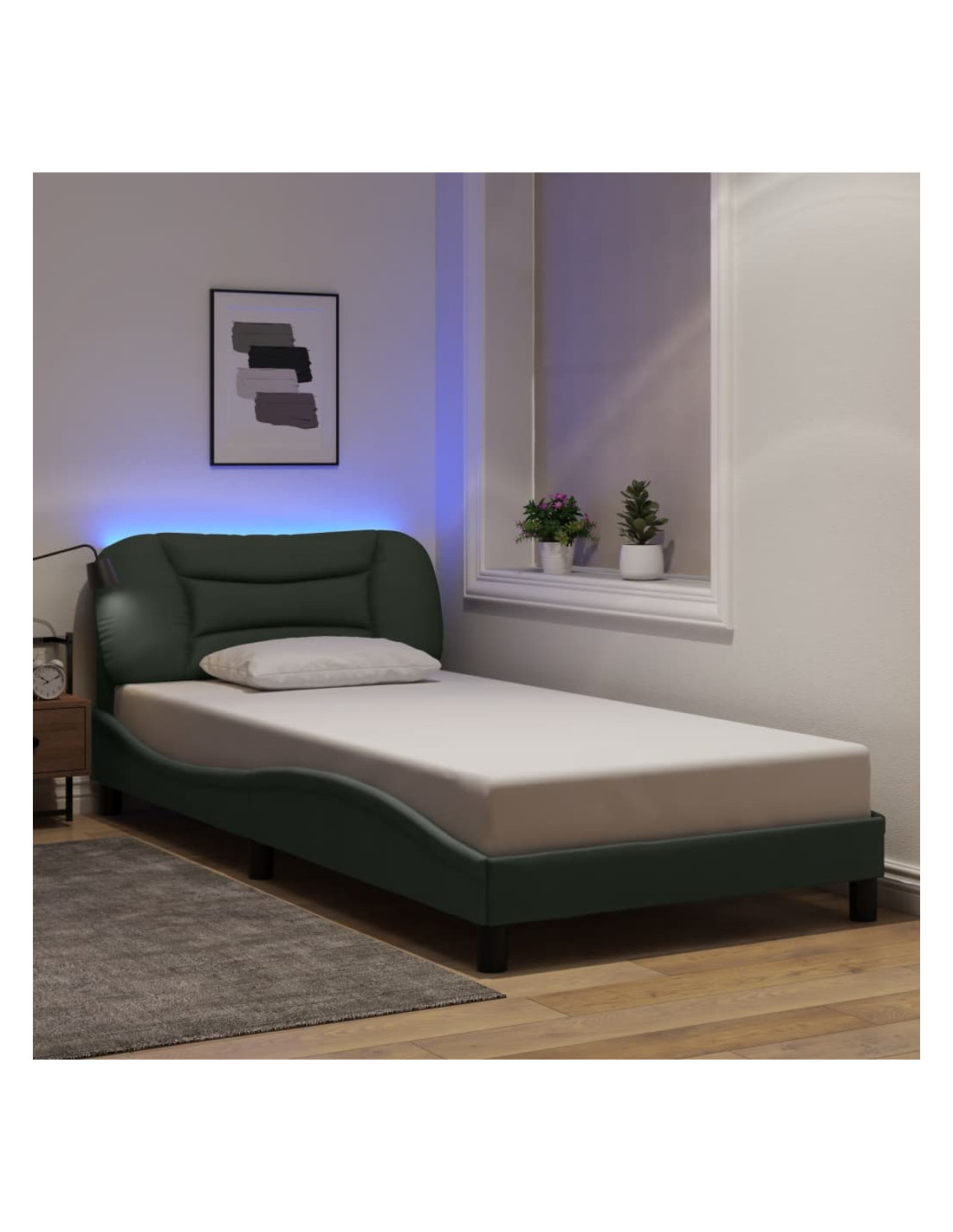 Questo giroletto con le luci LED vi permetterà di dormire meglio e in modo riposante! È un'accogliente aggiunta a qualsiasi camera da letto. Materiale resistente: Il tessuto presenta un aspetto semplice e pulito, ed è traspirante e resistente.Doghe in compensato: Le doghe in compensato conferiscono una buona distribuzione del peso, garantendo che il materasso rimanga in posizione ad ogni movimento del vostro corpo durante il sonno.Supporto eccellente: la testata del letto vi offre un eccellente supporto per la schiena mentre siete seduti sul letto per leggere o guardare la TV.Stringa di luci LED colorate: Portate il divertimento nel buio con queste luci a LED colorate! Le chiusure a strappo sul retro del cuscino testiera possono essere utilizzate per fissare le luci a LED.Design laterale ondulato: L'aspetto ondulato del giroletto è elegante e sofisticato, aggiungendo un tocco moderno e raffinato al vostro arredamento, rendendolo il punto focale della vostra camera da letto. Buono a sapersi:Il materasso non è incluso con questo letto. Offriamo una vasta scelta di materassi. Potete fare riferimento al nostro negozio per trovare un materasso da abbinare.Il prodotto è dotato di un connettore USB che richiede una fonte di alimentazione USB certificata da 5 V (non inclusa).