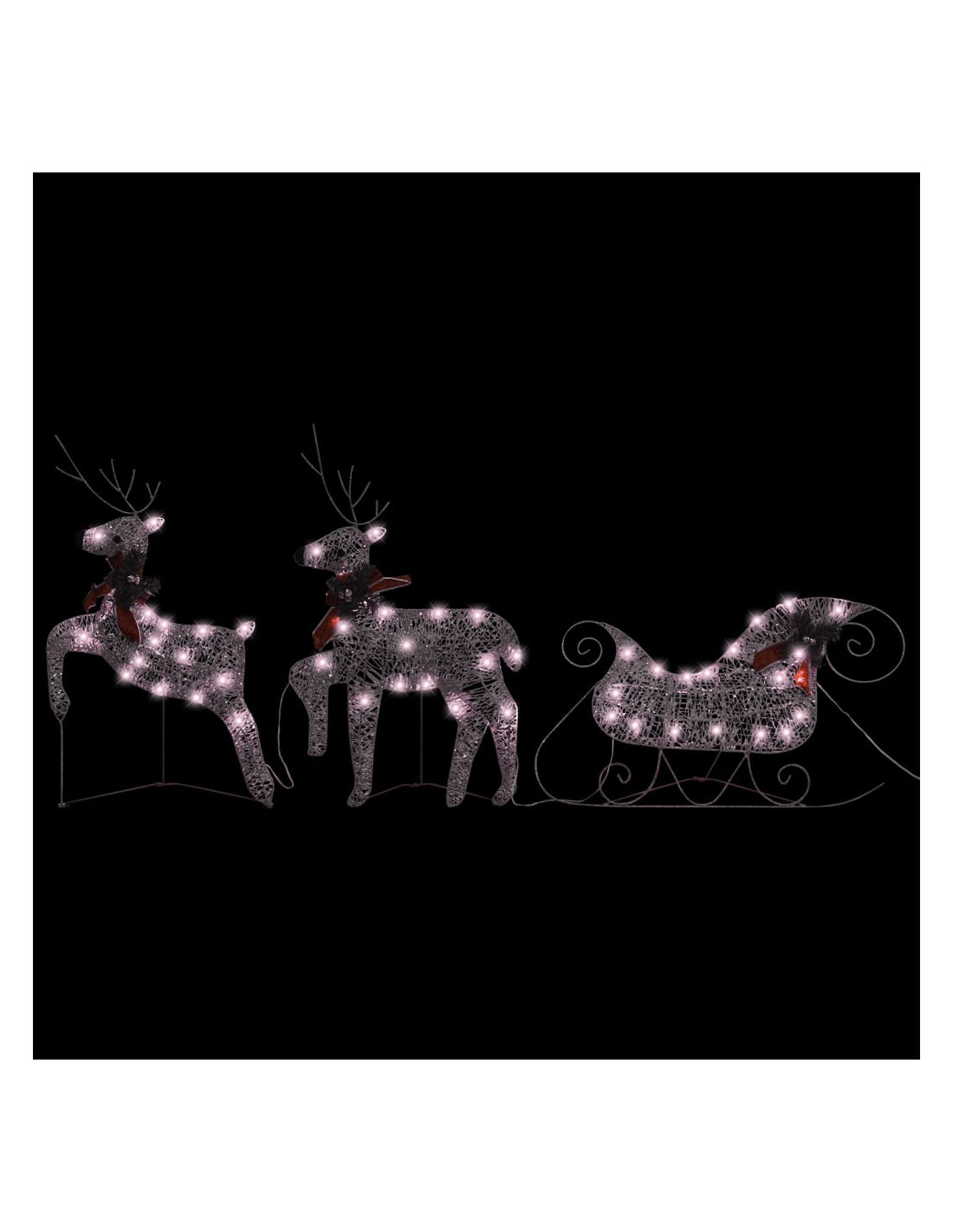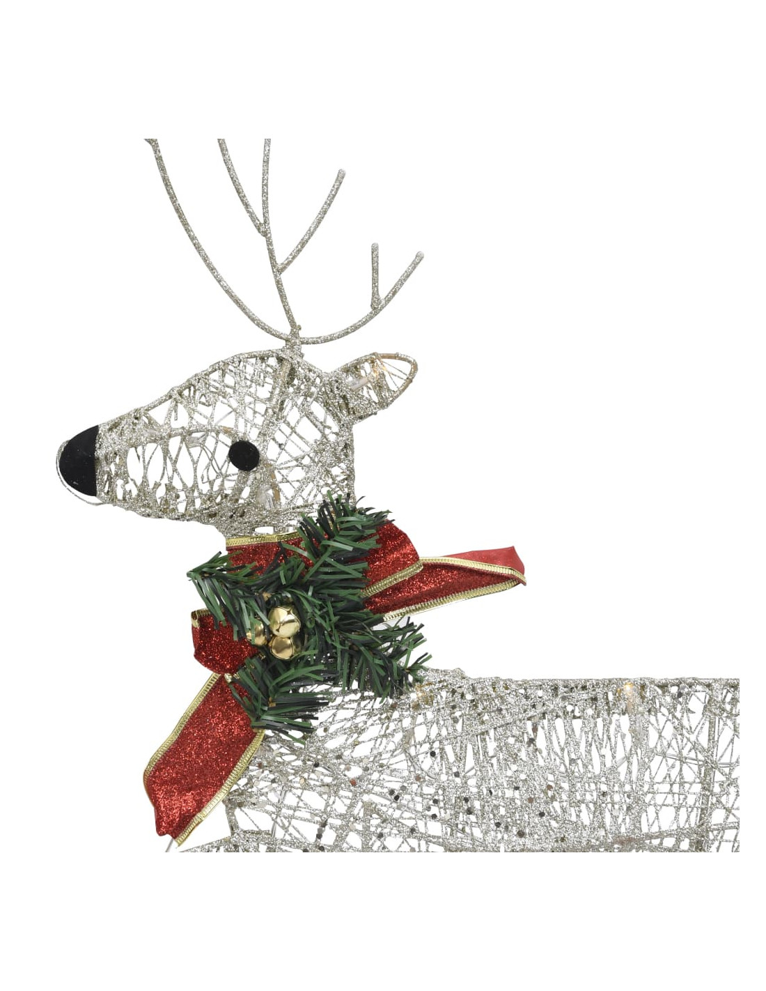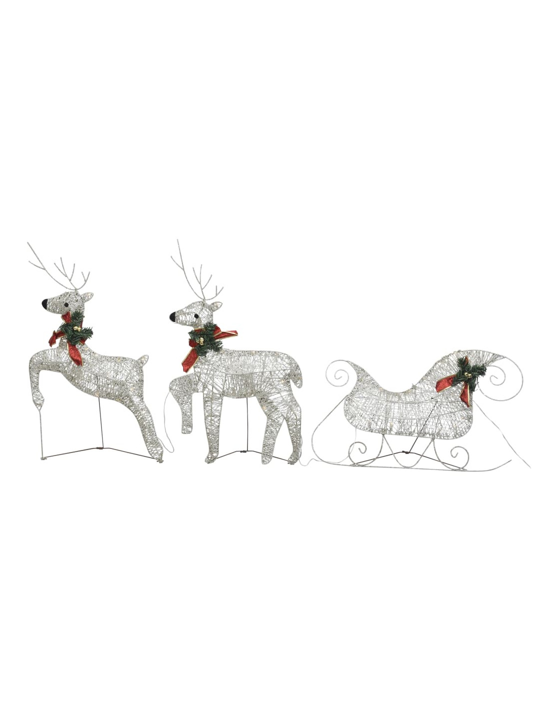 Realizzate in rete attorno a una struttura in metallo, sono perfettamente resistenti agli agenti atmosferici durante le festività natalizie. Possono anche essere utilizzate in ambienti interni, come il soggiorno, la camera dei bambini, ecc. Sono pre-illuminate con 60 luci a LED, a risparmio energetico e di lunga durata. La renna e la slitta presentano anche un fiocco rosso decorativo.