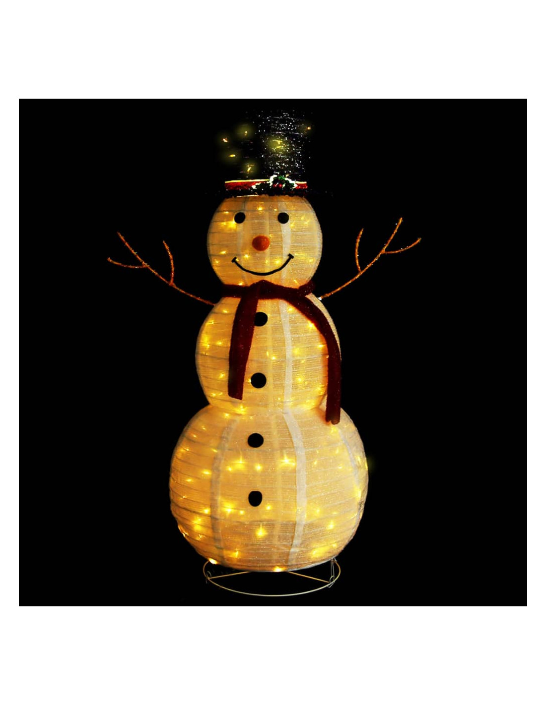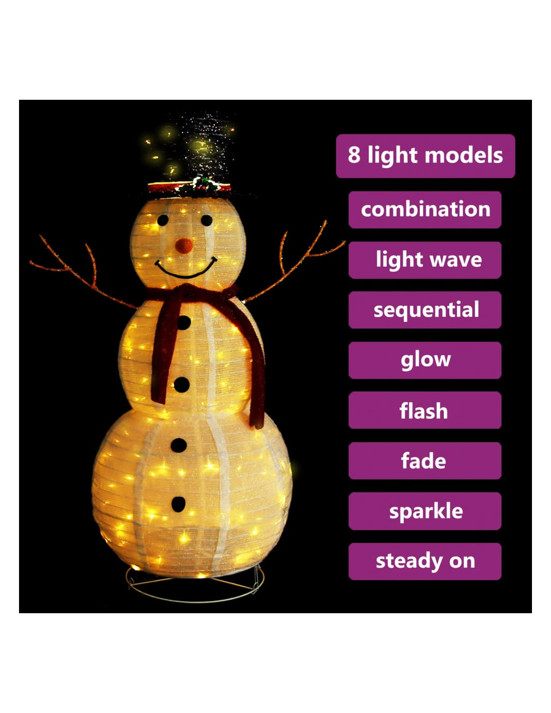 Questo pupazzo di neve è realizzato in tessuto spesso. Inoltre, questa decorazione natalizia dispone di 120 luci a LED, che sono efficienti dal punto di vista energetico e di lunga durata. Questa decorazione, progettata con 8 diversi effetti luce, si illumina magnificamente e crea una magica atmosfera natalizia: una combinazione di tutti gli effetti, bagliore lento, scintillio/flash, onde di luce, scorrevole, sequenziale, luce fissa e dissolvenza lenta.