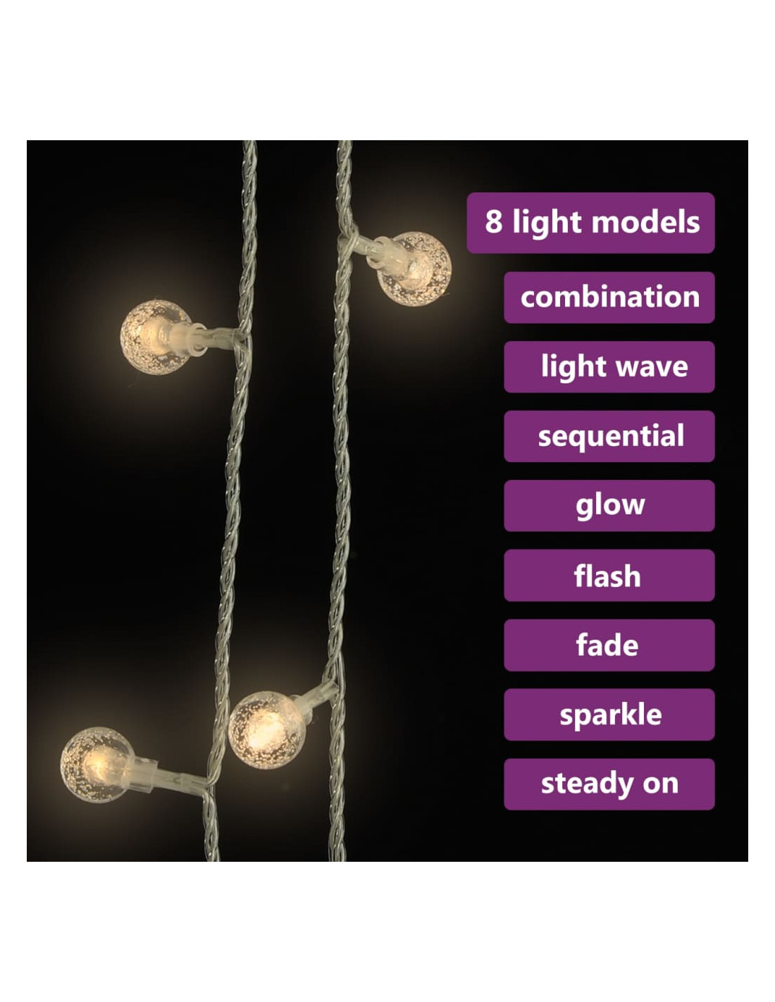 La decorazione è dotata di 200 LED a risparmio energetico, che creano una magica illuminazione. Ha 8 diversi effetti luce: modalità combinata, a onde, modalità sequenziale, modalità a luce lenta, lampeggiante, modalità a dissolvenza lenta, luce scintillante e continua. È un ottimo accessorio decorativo per illuminare gli spazi interni ed esterni.