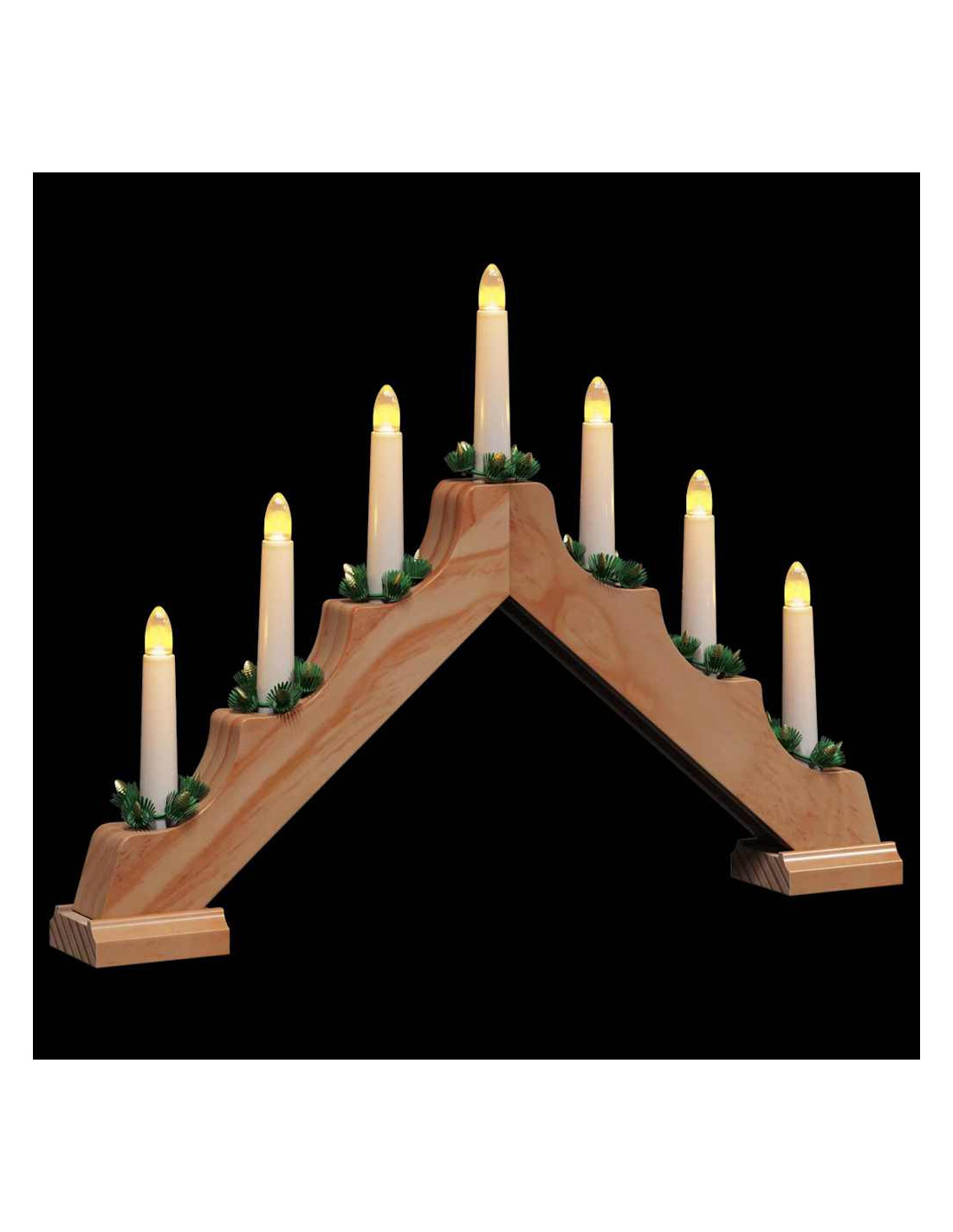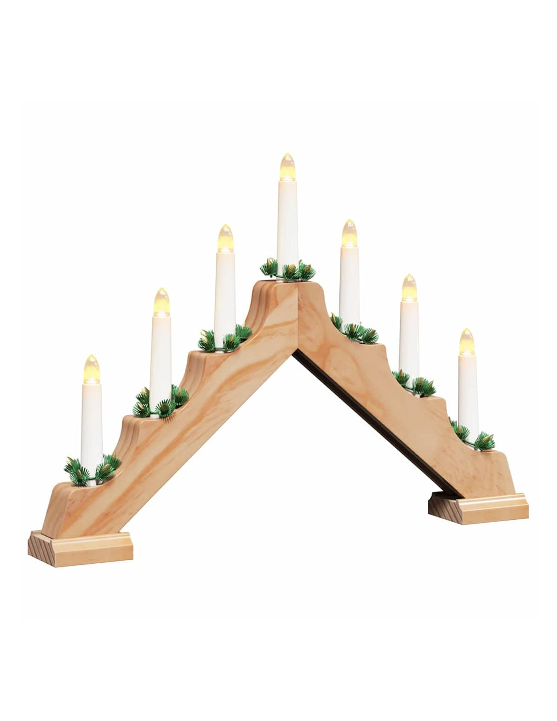 Il ponte con 7 candele LED è un pezzo ben fatto che porta eleganza e fascino festivo alla tua decorazione. Perfetto per il soggiorno o la sala da pranzo, le sue luci LED calde creano un'atmosfera accogliente e rilassante, catturando lo spirito delle festività. Il suo design tradizionale si abbina bene a mobili più elaborati, rendendolo un'aggiunta elegante in qualsiasi ambiente festivo. Il legno di pino classico e la sua delicata illuminazione lo rendono un centro piacevole per le riunioni natalizie.