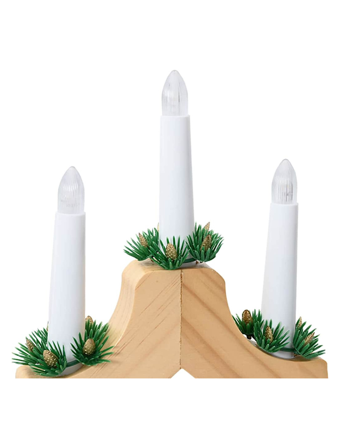 - Componenti Inclusi: Viene fornito con sette candele LED, ognuna racchiusa in un elegante arco di legno di pino e alimentato a batterie. Le luci LED sono un'alternativa efficiente dal punto di vista energetico rispetto all'illuminazione tradizionale, emettendo una luce calda e accogliente. Con un interruttore alternato, è facile da usare, portando comodità sia nella preparazione che nell’utilizzo.