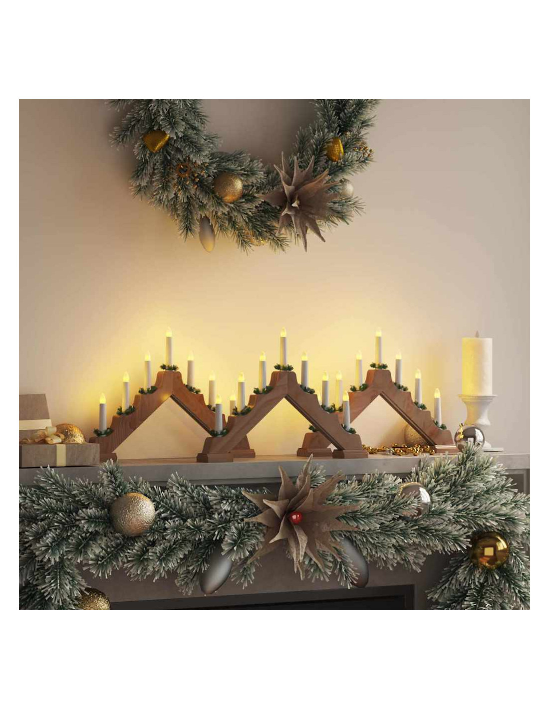 - Utilizzi Consigliati: Perfetto per migliorare la decorazione natalizia interna, questo ponte di candele si adagia piacevolmente su camini, tavoli o davanzali. Il suo calore invitante trasforma ogni spazio interno in un rifugio festoso, creando un’atmosfera gioiosa per riunioni familiari o momenti di riflessione.