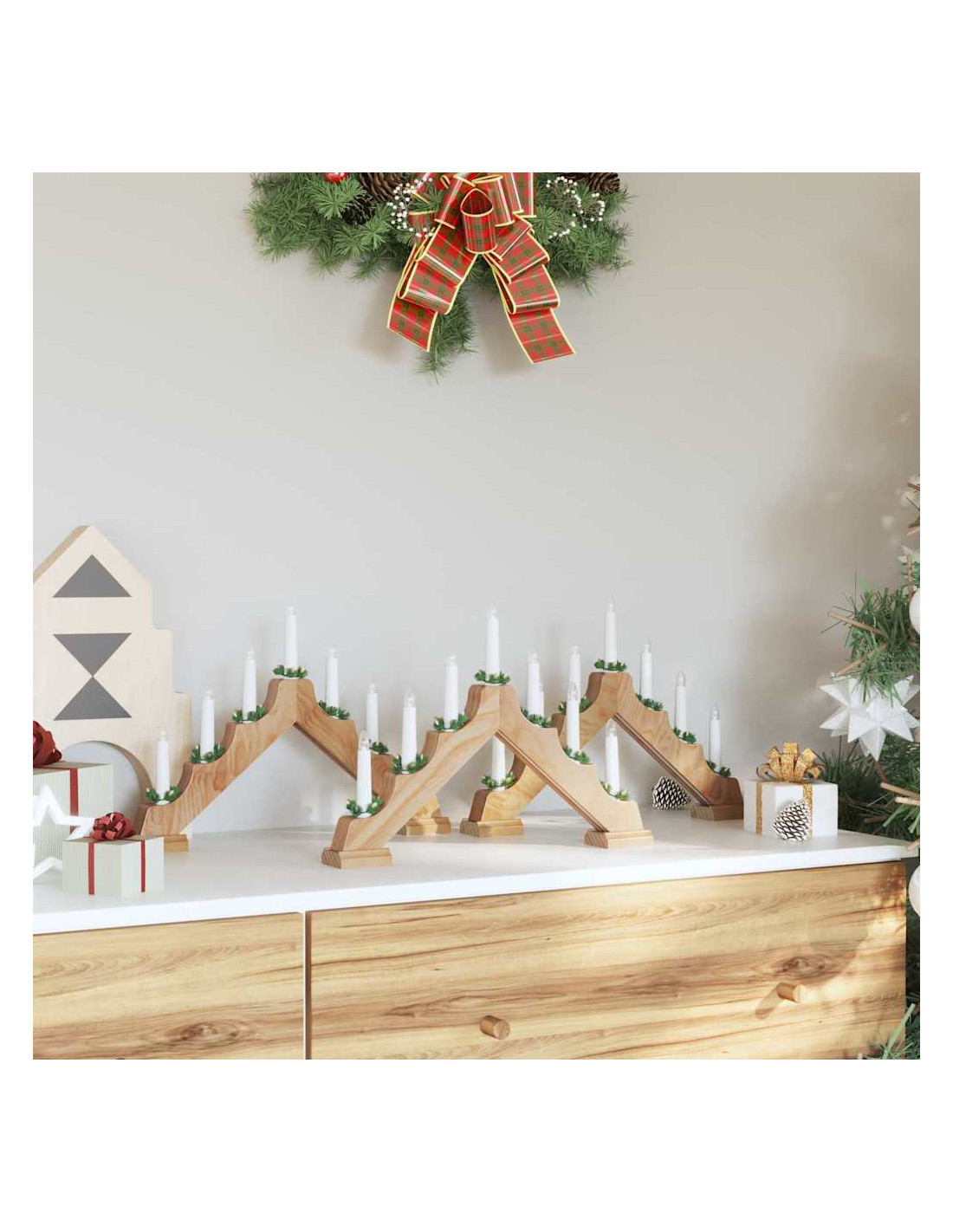 - Materiali: Fatto in legno massello di pino, questo ponte di candele natale mostra una bella finitura naturale che esalta il suo fascino tradizionale. Il legno di pino si estende lungo tutto il pezzo, garantendo robustezza e durata durante le festività e oltre. Questa scelta di materiale combina resistenza e bellezza visiva, rendendolo un elemento prezioso per la decorazione natalizia del tuo soggiorno o sala da pranzo.