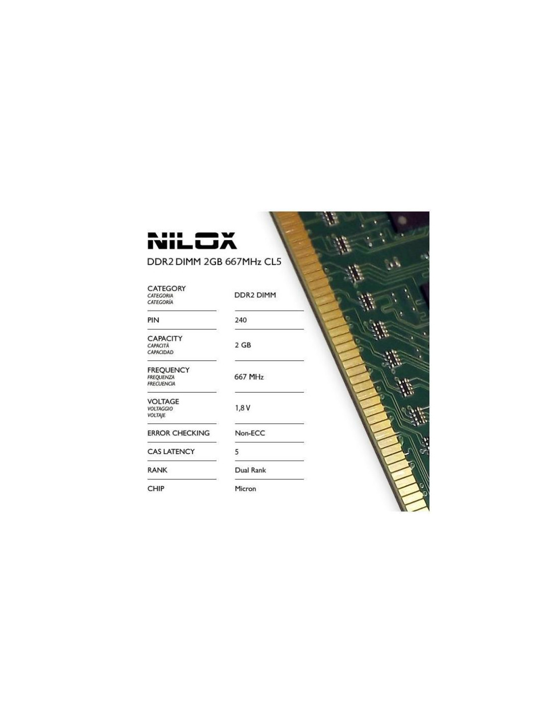 Nilox 2GB PC2-5300. Componente per: PC/server, Memoria Interna: 2 GB, Configurazione della memoria (moduli x dimensione): 1 x 2 GB, Tipo di RAM: DDR2, Velocità memoria: 667 MHz, Fattore di forma memoria: 240-pin DIMM, Latenza CAS: 2.5, Colore del prodotto: Verde