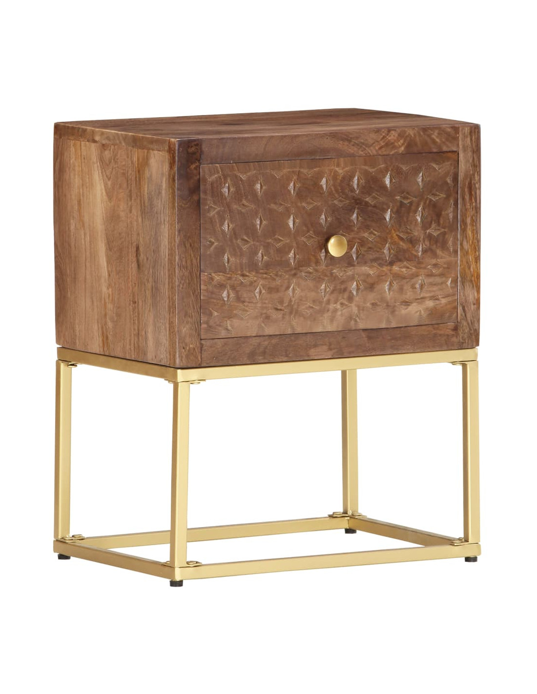 Il comodino, con dettagli intagliati a mano nella parte anteriore, è realizzato a mano in legno massello di mango, un tipo di legno robusto con belle venature e contorni marroni o dorati sulla sua superficie. Ogni fase del processo di lavorazione è stata eseguita con la massima cura, che si tratti di lucidatura o laccatura, mentre la maestria artigianale conferisce uno spettacolare stile retrò. Le bellissime venature del legno rendono ogni mobile unico e leggermente diverso dagli altri. Inoltre, la struttura in acciaio verniciato a polvere aggiunge uno stile industriale al mobile in legno. Questo comodino è dotato di 1 cassetto, che offre ampio spazio per tenere in ordine e a portata di mano tutti i tipi di oggetti più piccoli. L'articolo è facile da assemblare.