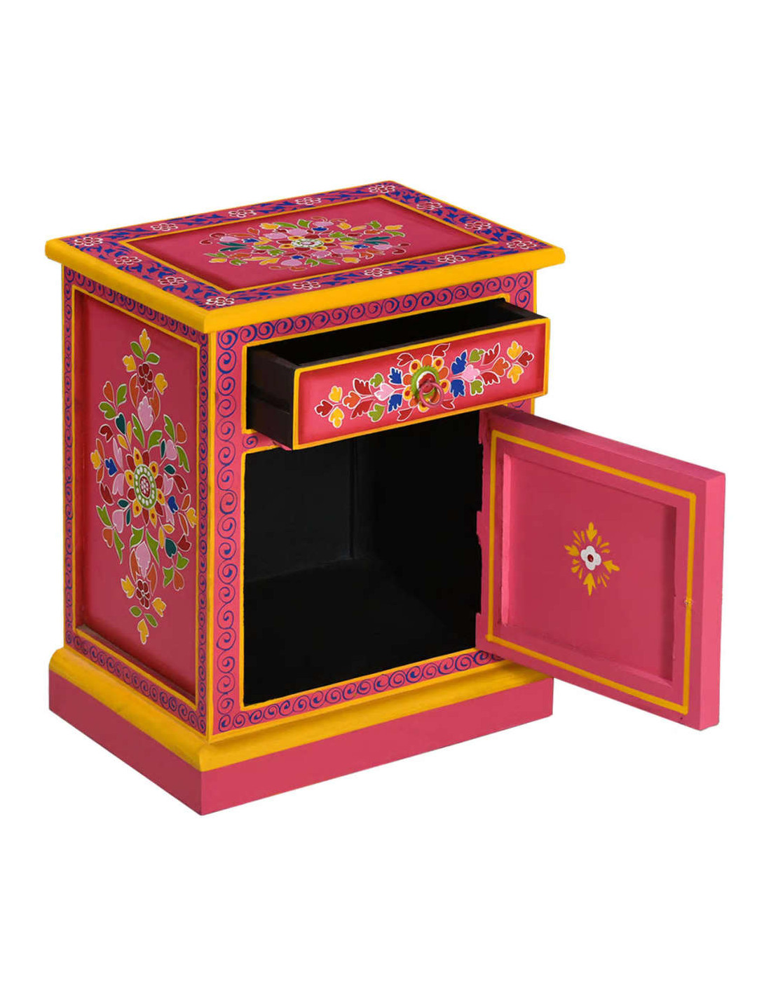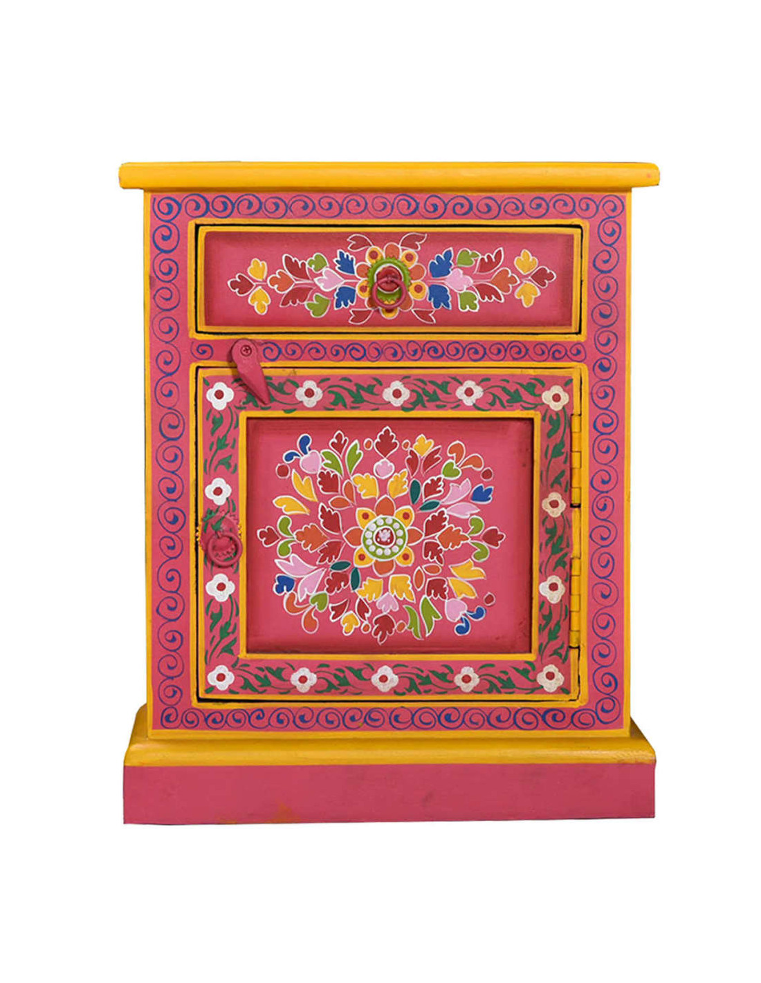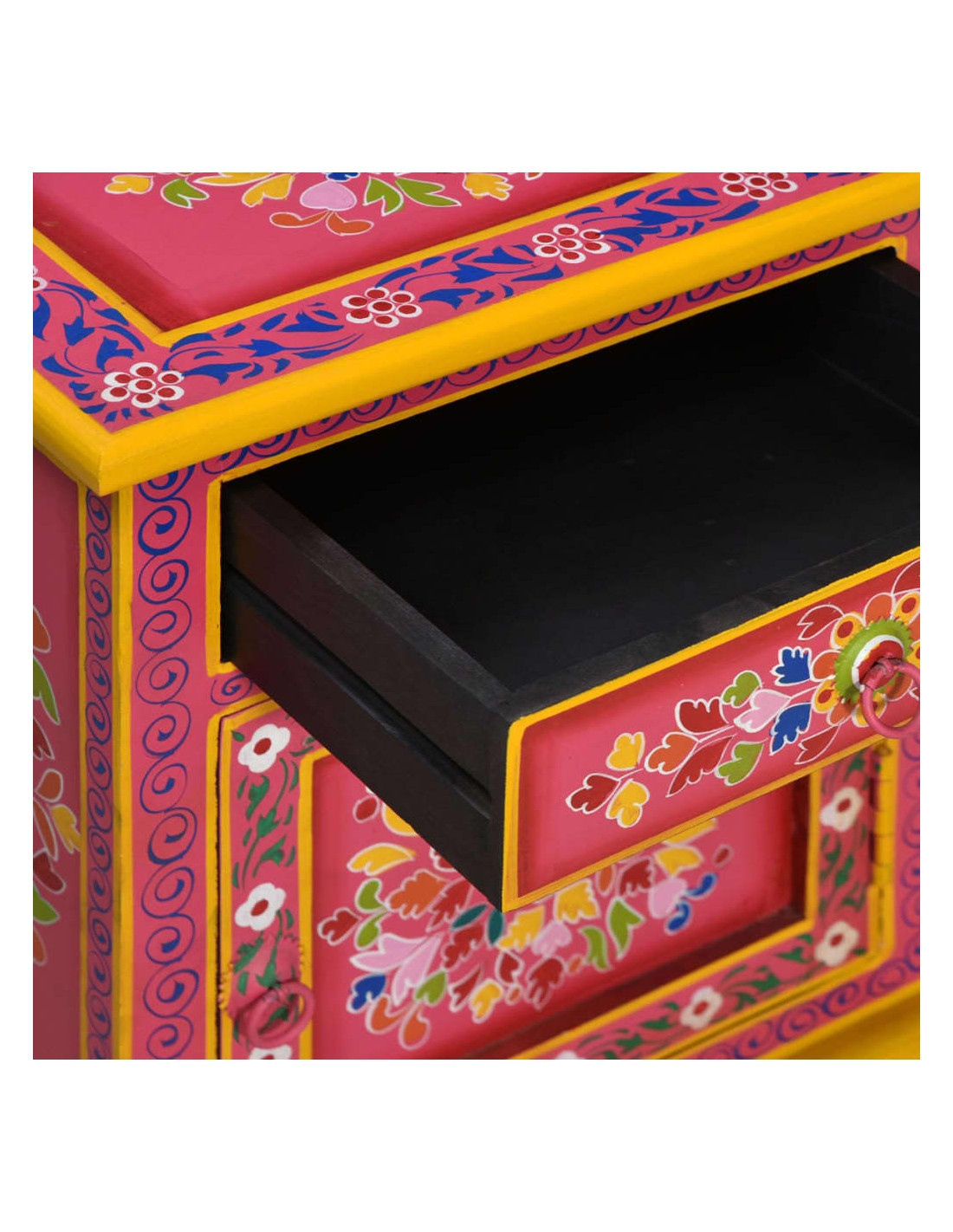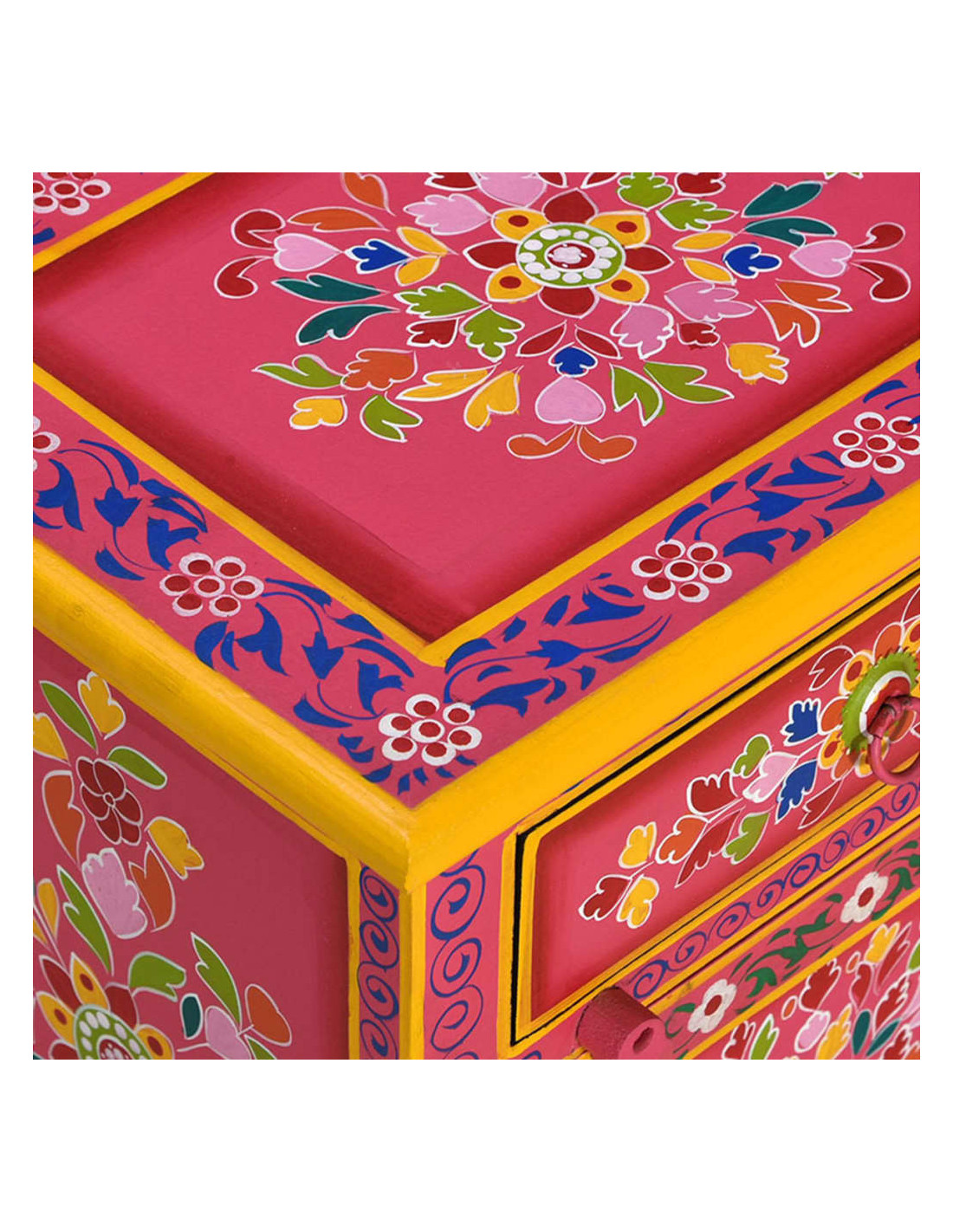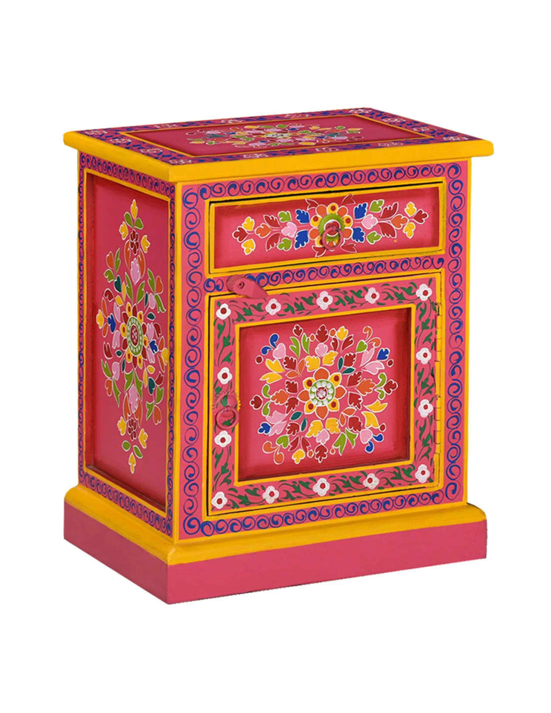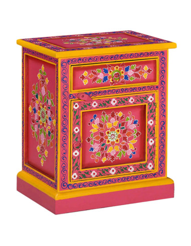 Il comodino è realizzato a mano in legno di mango, materiale che è sia resistente che attraente, e la lavorazione artigianale ne sottolinea lo spettacolare stile retrò. Ogni fase della lavorazione, dalla lucidatura alla verniciatura fino alla laccatura, è stata eseguita con la massima cura. Il mobile presenta ampi dettagli decorativi, dipinti a mano, che danno al comodino un carattere caldo e ricco.