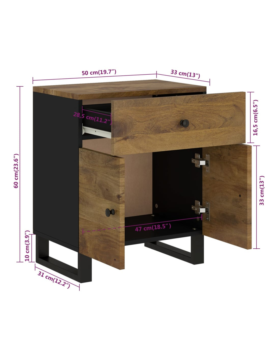 - Materiale: Legno massello di mango con finitura marrone ambra, legno multistrato, metallo