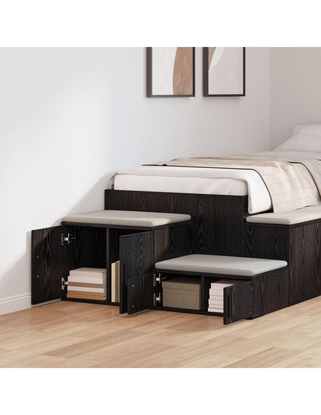 - Componenti pensati: Ha porte a cerniera e ripiani aperti, che ti permettono di avere la giusta flessibilità per riporre vari oggetti. Con maniglie nere per un facile accesso e uno sfondo accogliente, ogni dettaglio è pensato per essere pratico e bello da vedere.