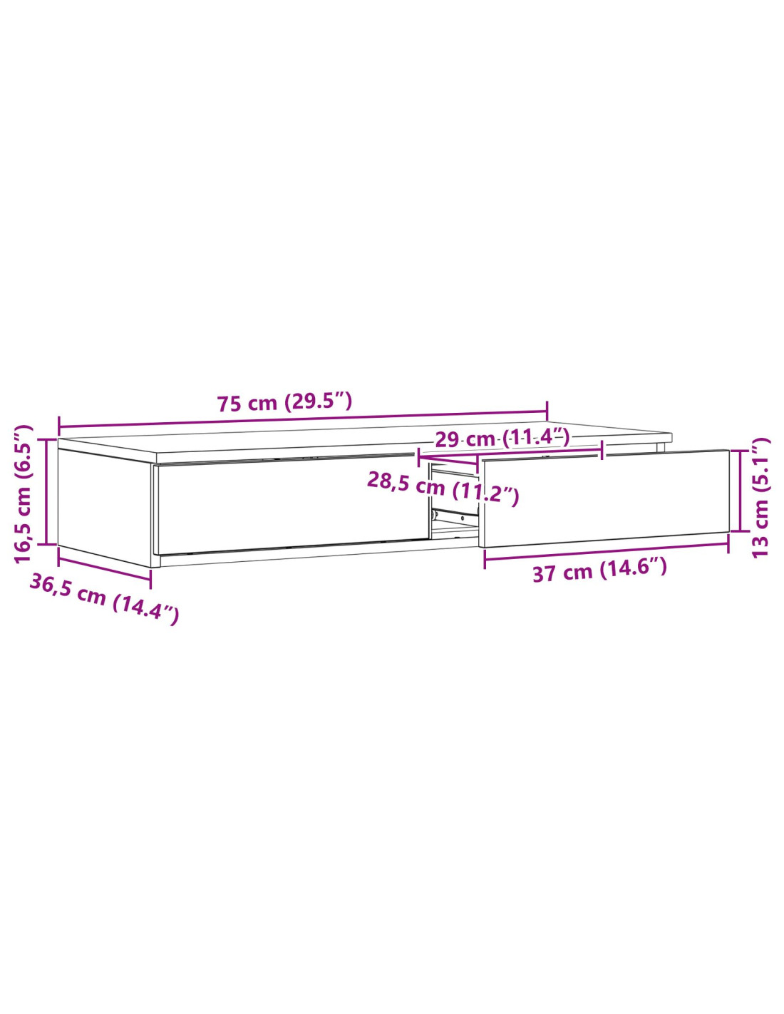 - Dimensioni complessive: 75 x 36,5 x 16,5 cm (L x P x A)