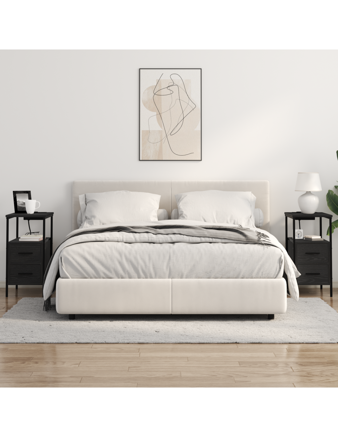- Componenti Inclusi: Il comodino ha cassetti con maniglie tradizionali, offrendo ampio spazio per le tue cose. Include anche una stazione di ricarica per caricare comodamente i tuoi dispositivi elettronici durante la notte. Questi dettagli pratici rendono questo pezzo un must per una vita ordinata in un ambiente moderno.