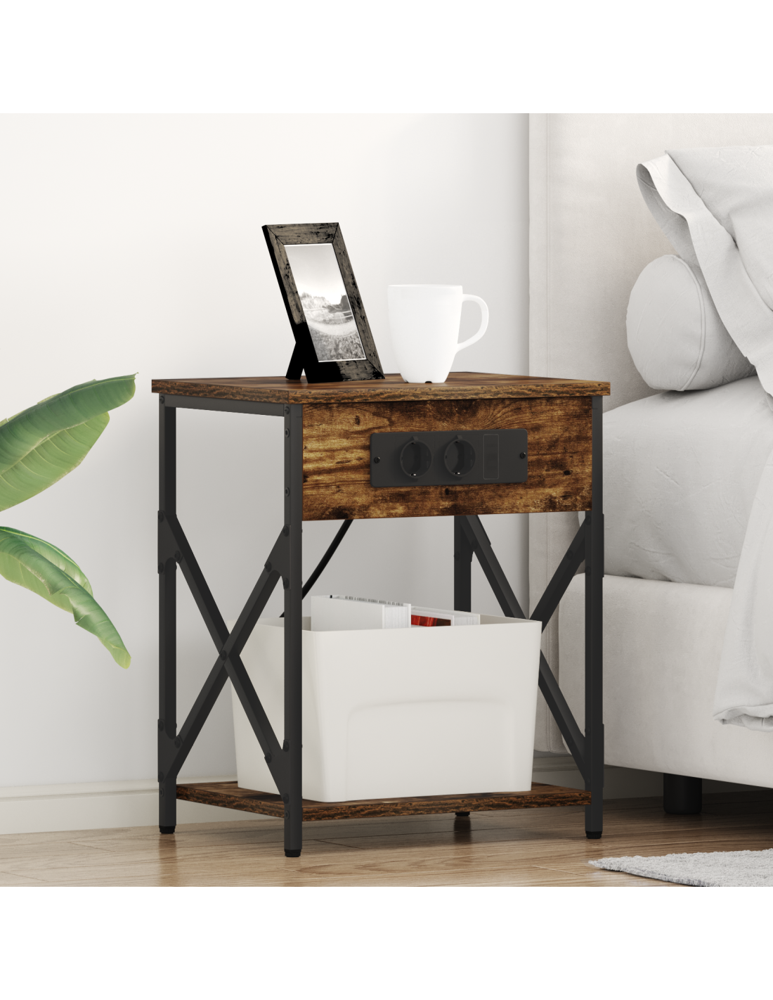 Questo comodino rustico con stazione di ricarica è un mix perfetto di praticità e stile, ideale per ogni camera da letto. La sua dimensione compatta e la forma rettangolare lo rendono perfetto per le esigenze notturne, con un fascino naturale e robusto. Realizzato in legno ingegnerizzato con un telaio in acciaio per garantire durata e praticità, mentre la stazione di ricarica integrata e gli scompartimenti rendono la vita moderna più semplice.