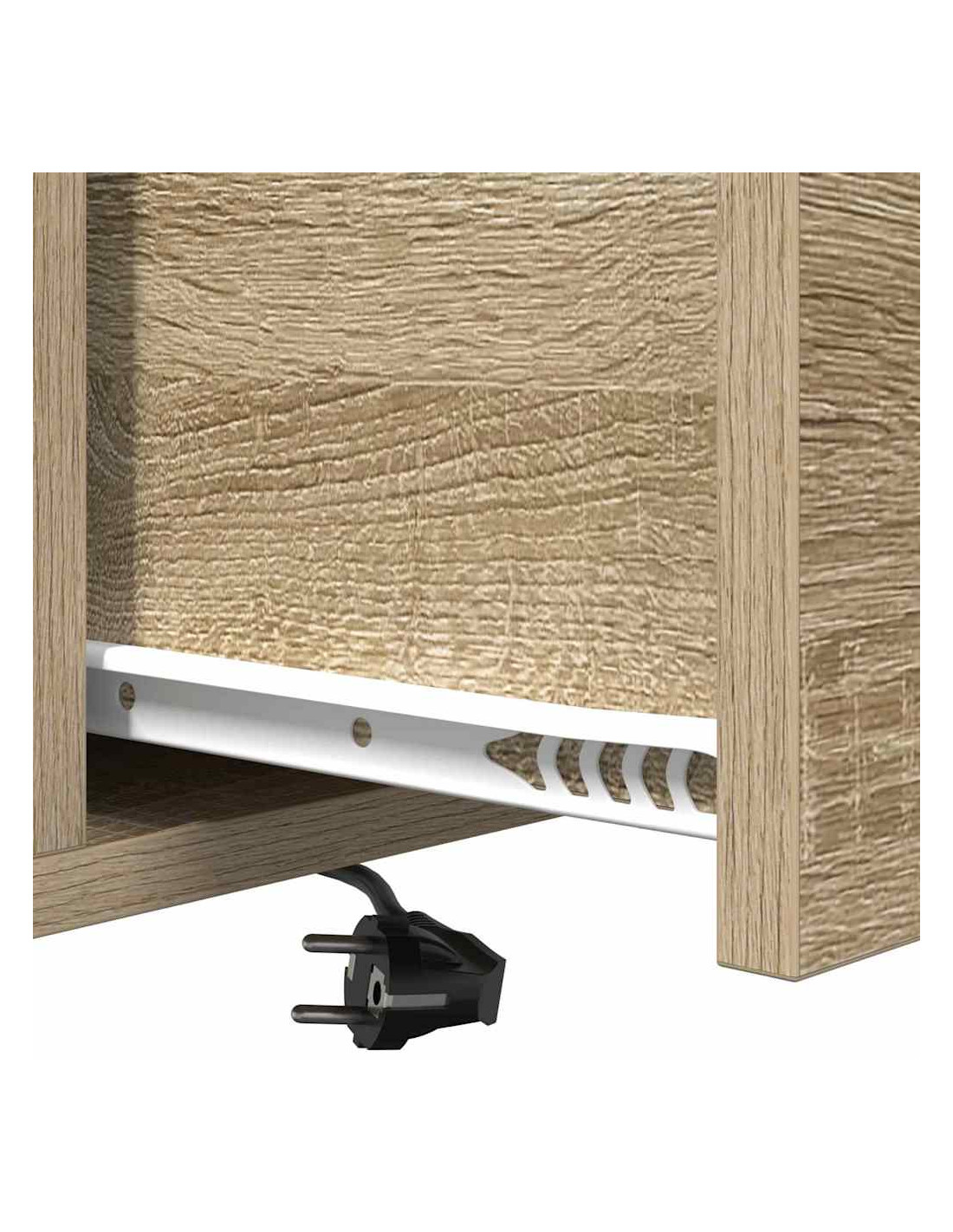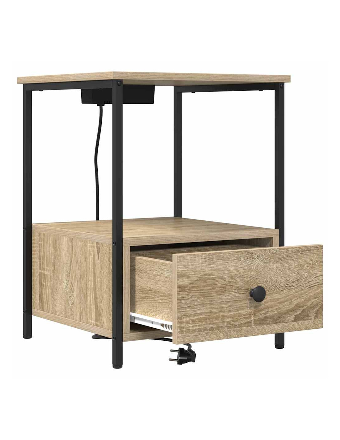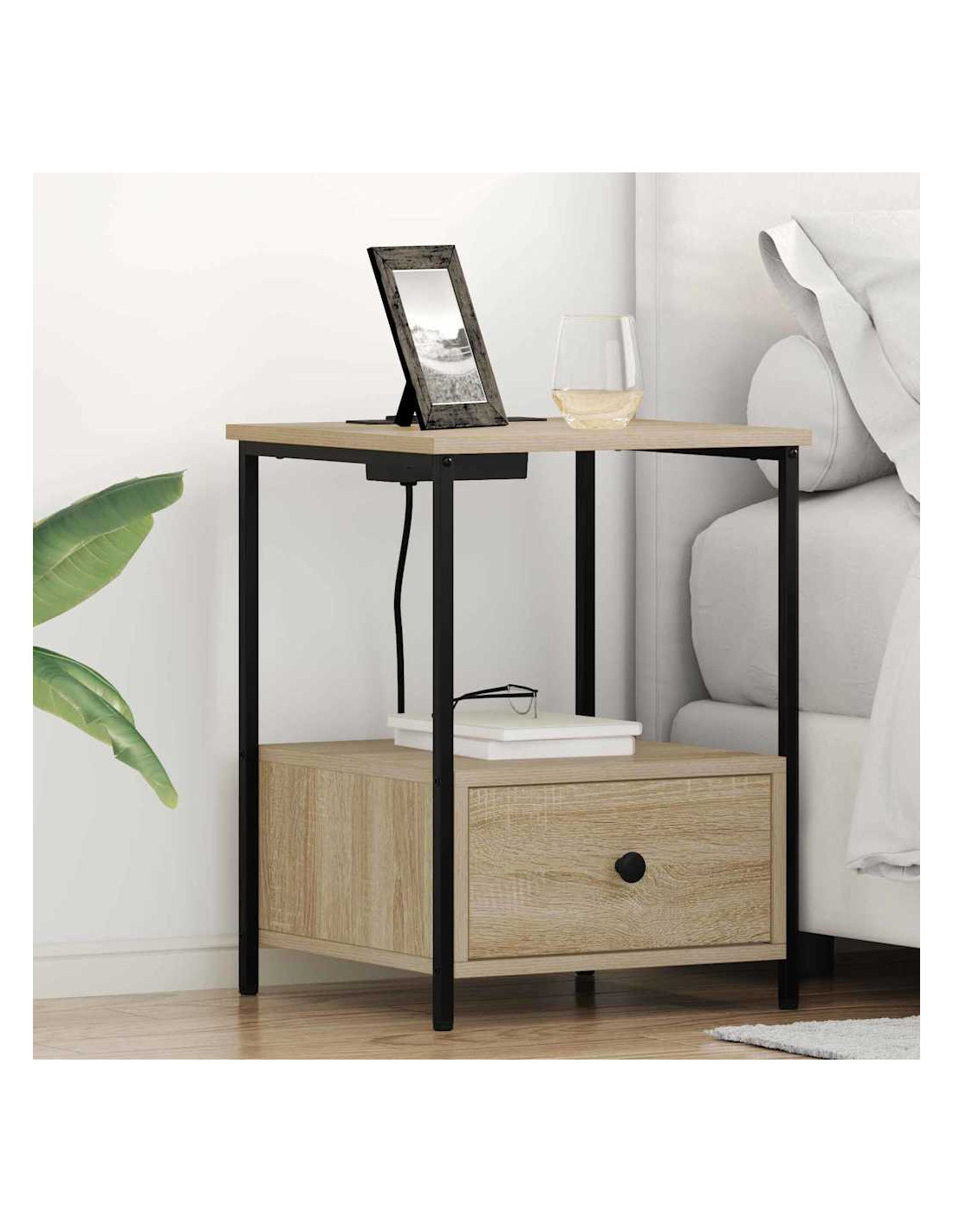 Questo comodino è la soluzione ideale per chi cerca un mix di funzionalità e stile. Con il suo look rustico, si adatta facilmente a vari stili di decorazione della camera da letto. La superficie superiore offre spazio per una lampada, una sveglia o un libro, mentre la stazione di ricarica integrata fa sì che i tuoi dispositivi siano sempre pronti. Il legno ingegnerizzato con finitura naturale si abbina bene a solide gambe in acciaio, promettendo durabilità e stile nel tempo.