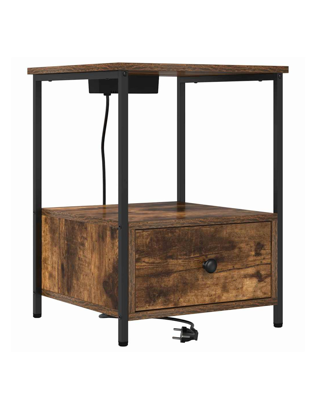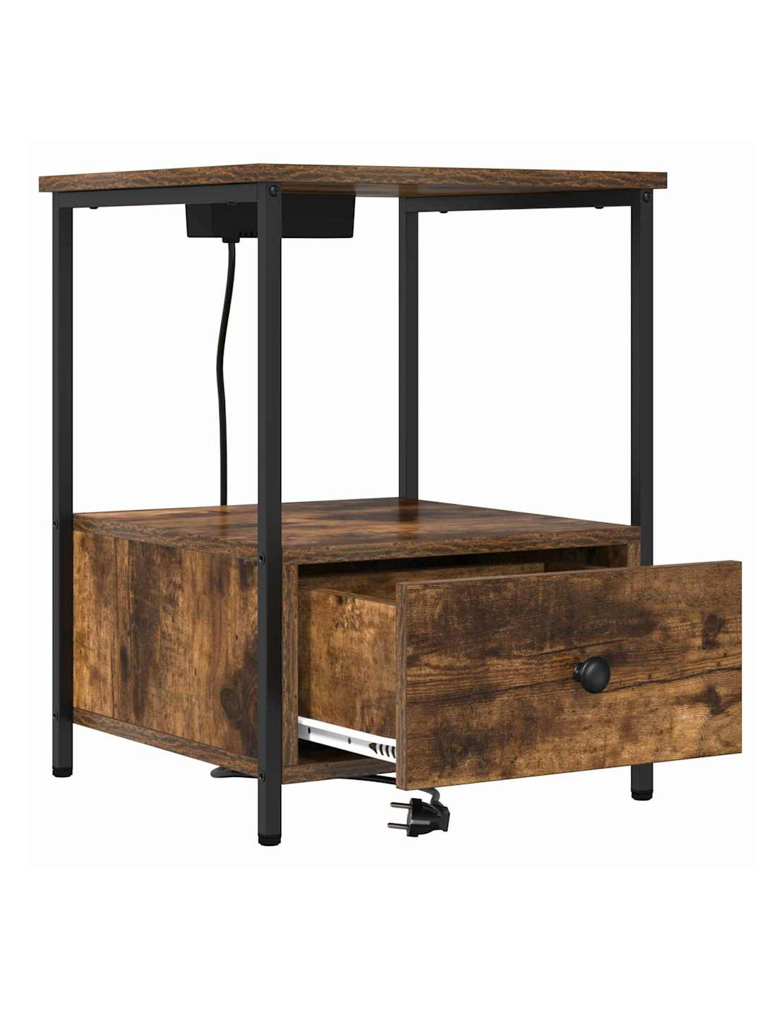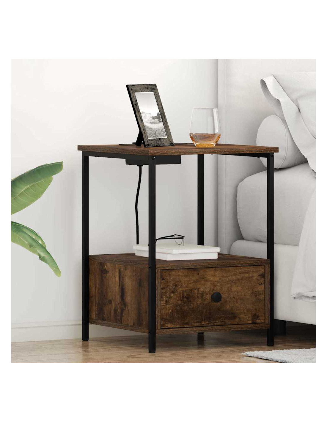 Questo comodino è la soluzione ideale per chi cerca un mix di funzionalità e stile. Con il suo look rustico, si adatta facilmente a vari stili di decorazione della camera da letto. La superficie superiore offre spazio per una lampada, una sveglia o un libro, mentre la stazione di ricarica integrata fa sì che i tuoi dispositivi siano sempre pronti. Il legno ingegnerizzato con finitura naturale si abbina bene a solide gambe in acciaio, promettendo durabilità e stile nel tempo.
