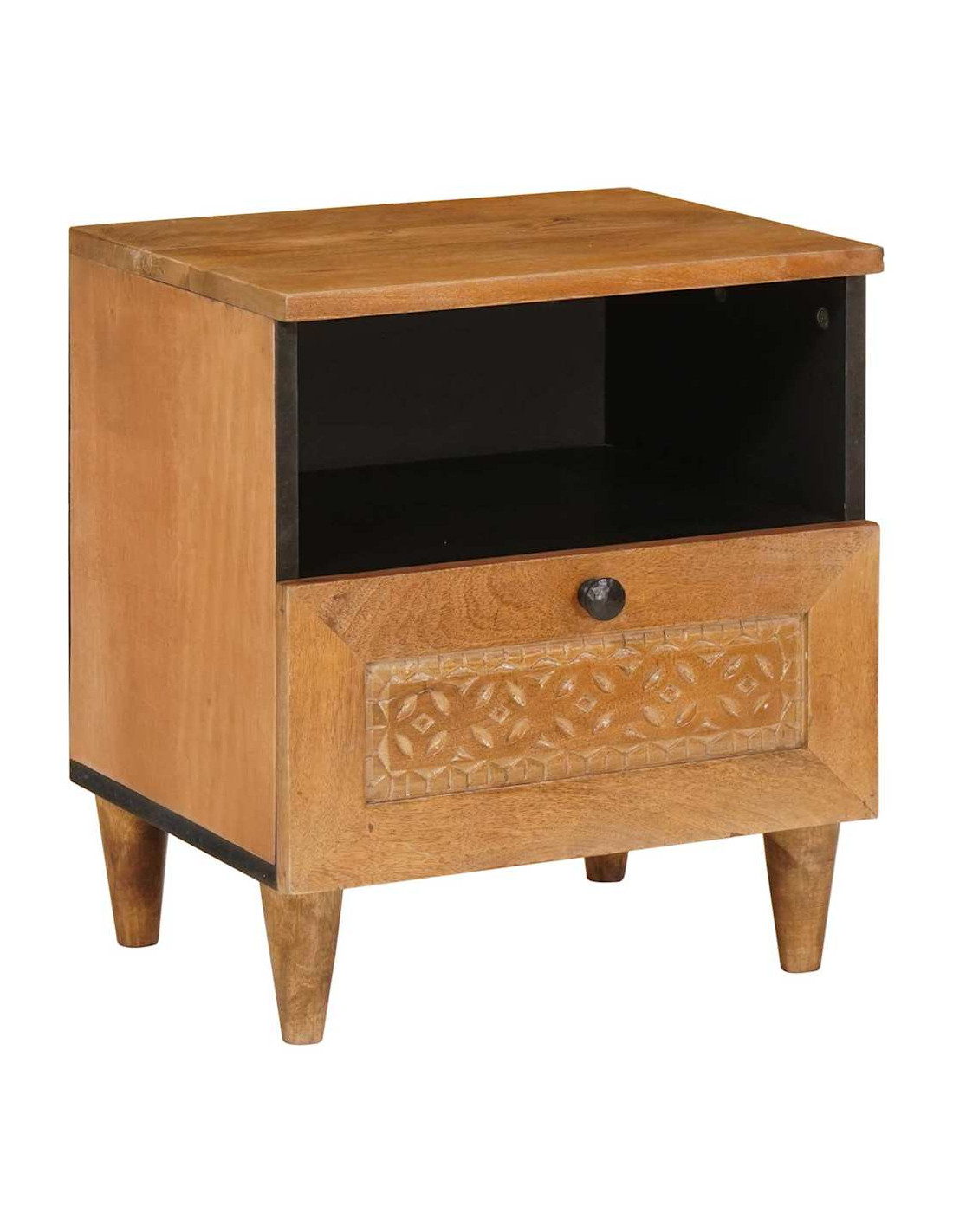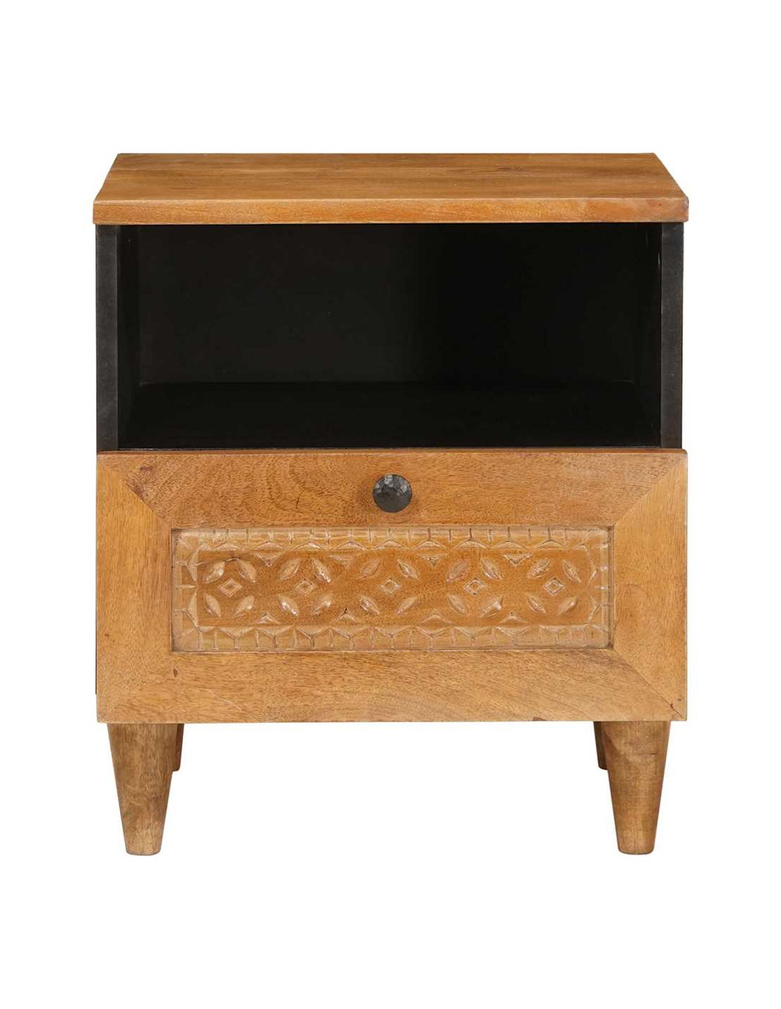 - Materiale in Legno Massello di Mango Questo tavolo è costruito con legno di mango di alta qualità, che gli dà resistenza e un bel look rustico. È noto per la sua durata, e il legno di mango mantiene questo pezzo sempre in forma anche con l'uso quotidiano. Inoltre, le venature naturali rendono ogni tavolo unico, aggiungendo carattere al tuo spazio. È robusto abbastanza da tenere tutti i tuoi must-have da comodino.