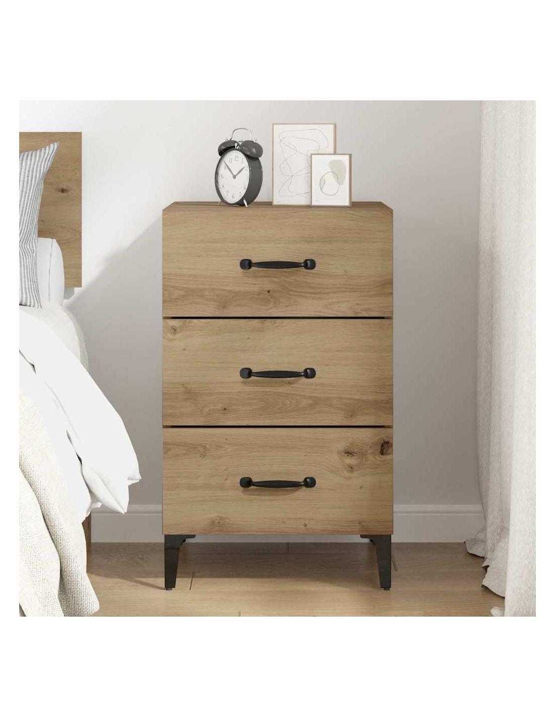 - Costruzione in Legno Ingegnerizzato: Questo comodino è fatto in legno ingegnerizzato, il che lo rende resistente e adatto all'uso quotidiano. La finitura opaca gli dà un'aria chic.
