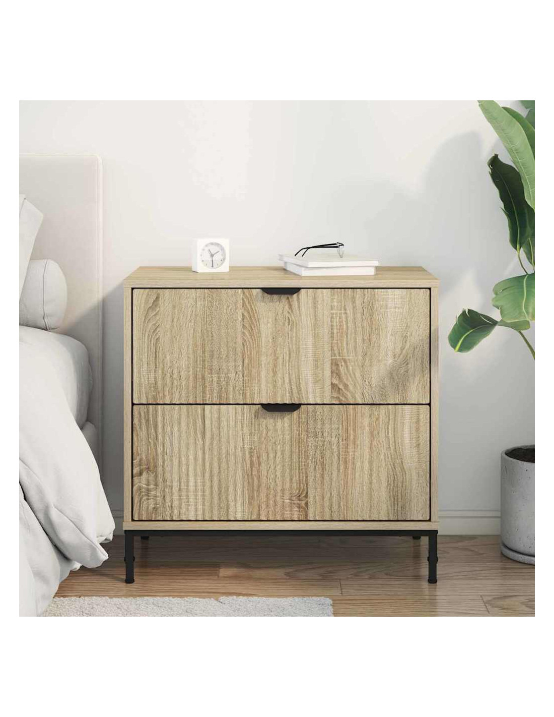 - Costruzione in legno ingegnerizzato: Questo comodino è fatto in legno ingegnerizzato di qualità per una struttura solida. Ha una finitura opaca che valorizza il suo look moderno. Il legno ingegnerizzato è durevole, quindi durerà nel tempo con solo un po'di manutenzione.