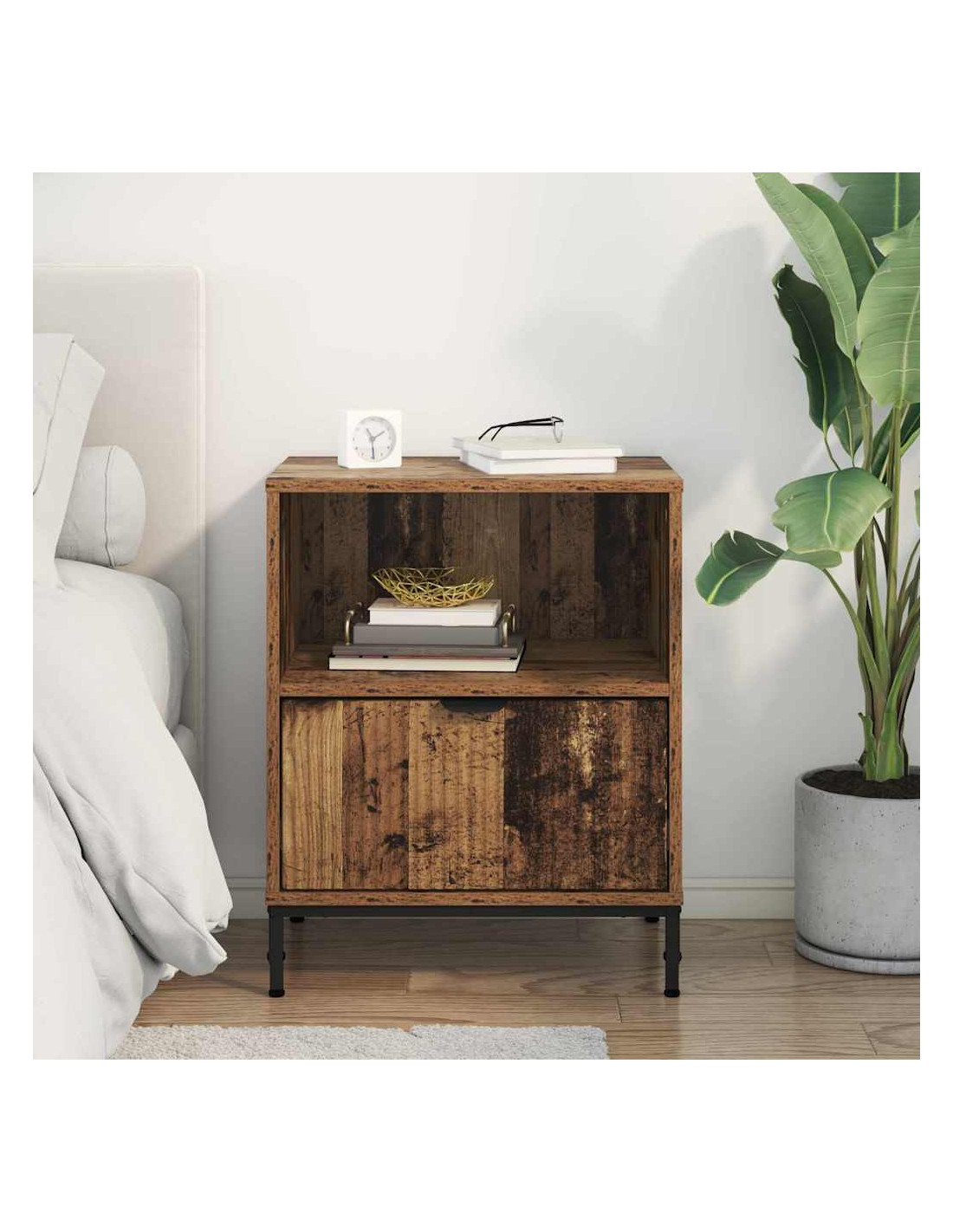 - Materiale di Costruzione: Questo comodino è fatto di legno ingegnerizzato di alta qualità, che offre una superficie liscia e stabilità duratura. Le gambe in acciaio forniscono un supporto solido, è pratico e con stile.