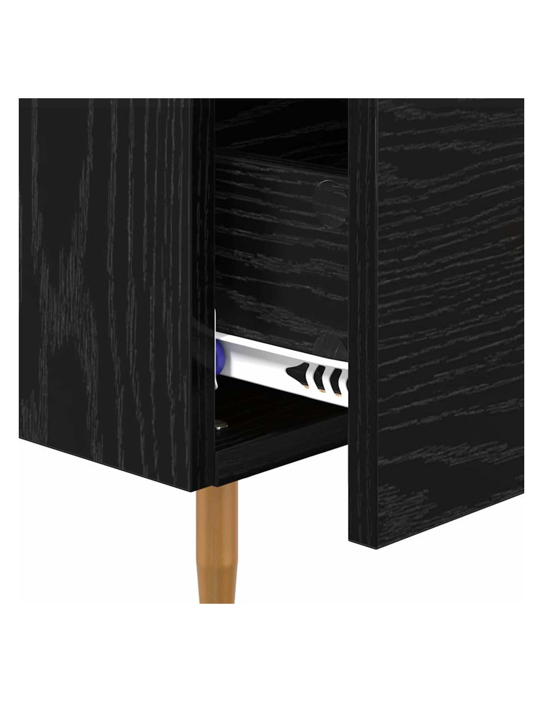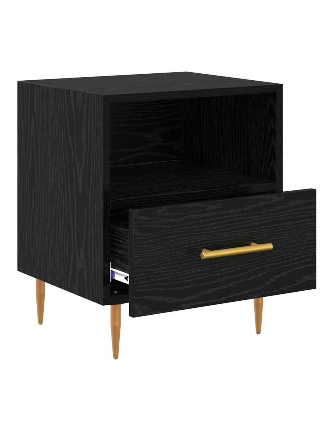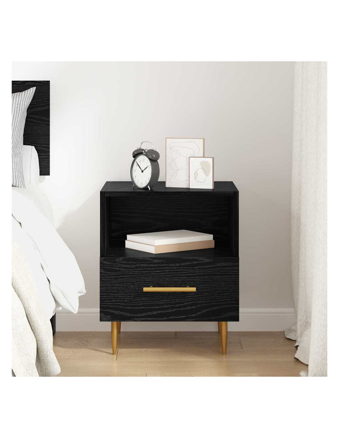 - Costruzione in Legno Ingegnerizzato Il comodino è realizzato in legno ingegnerizzato, resistente ma elegante. Questo materiale assicura durata e una finitura liscia che sottolinea il design moderno.