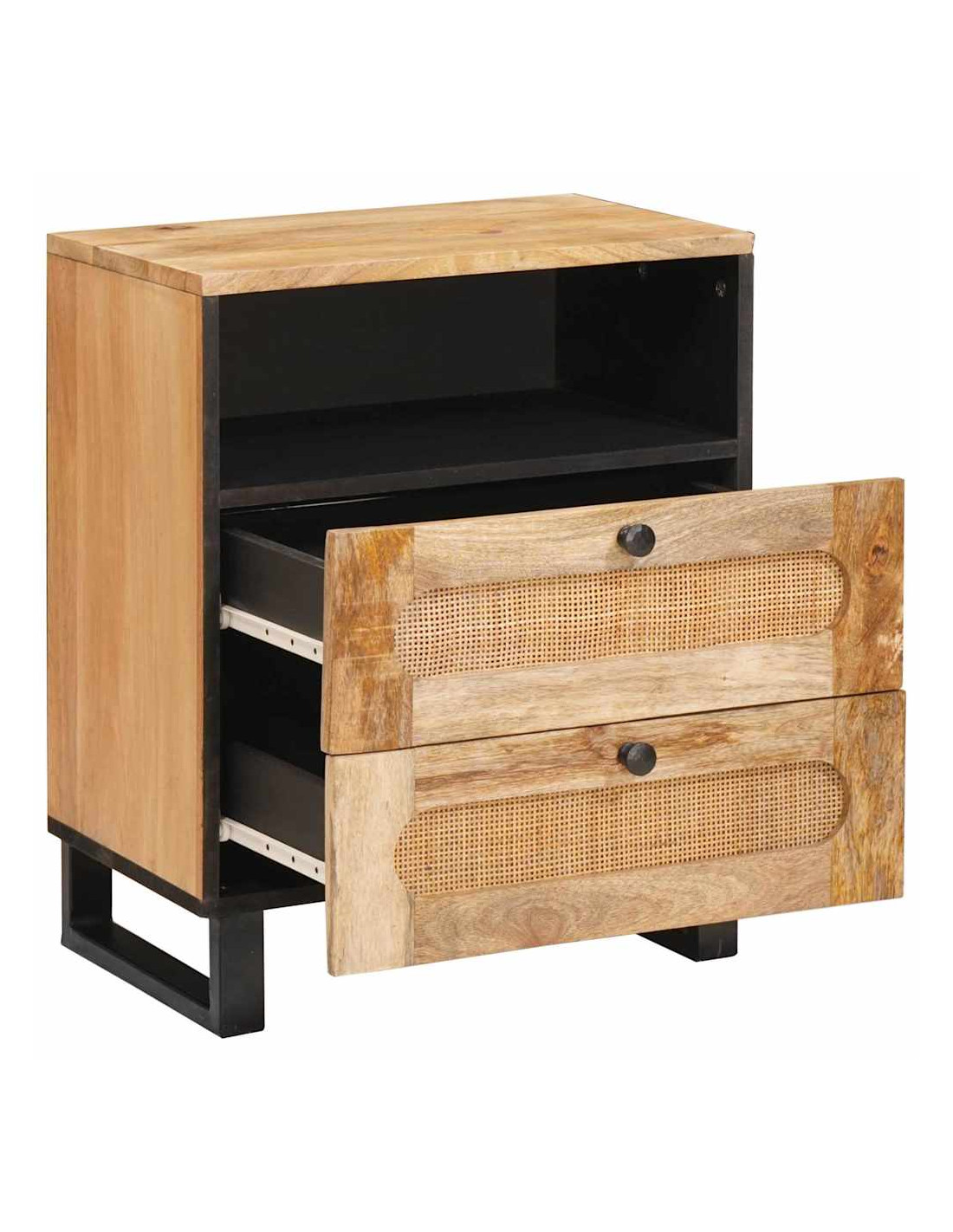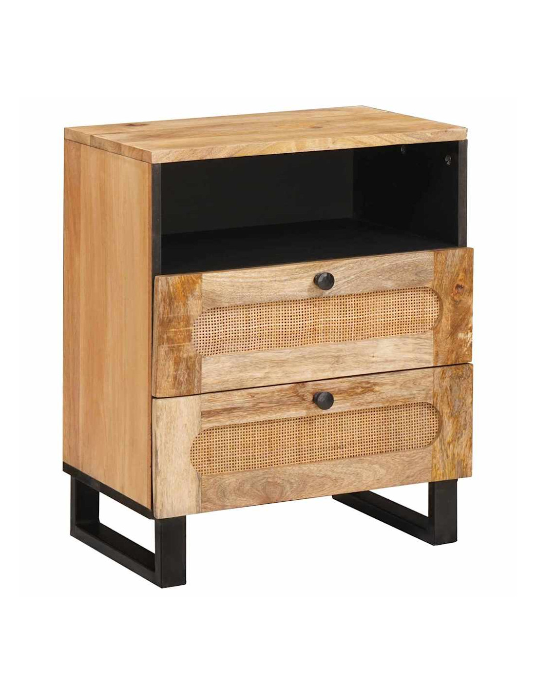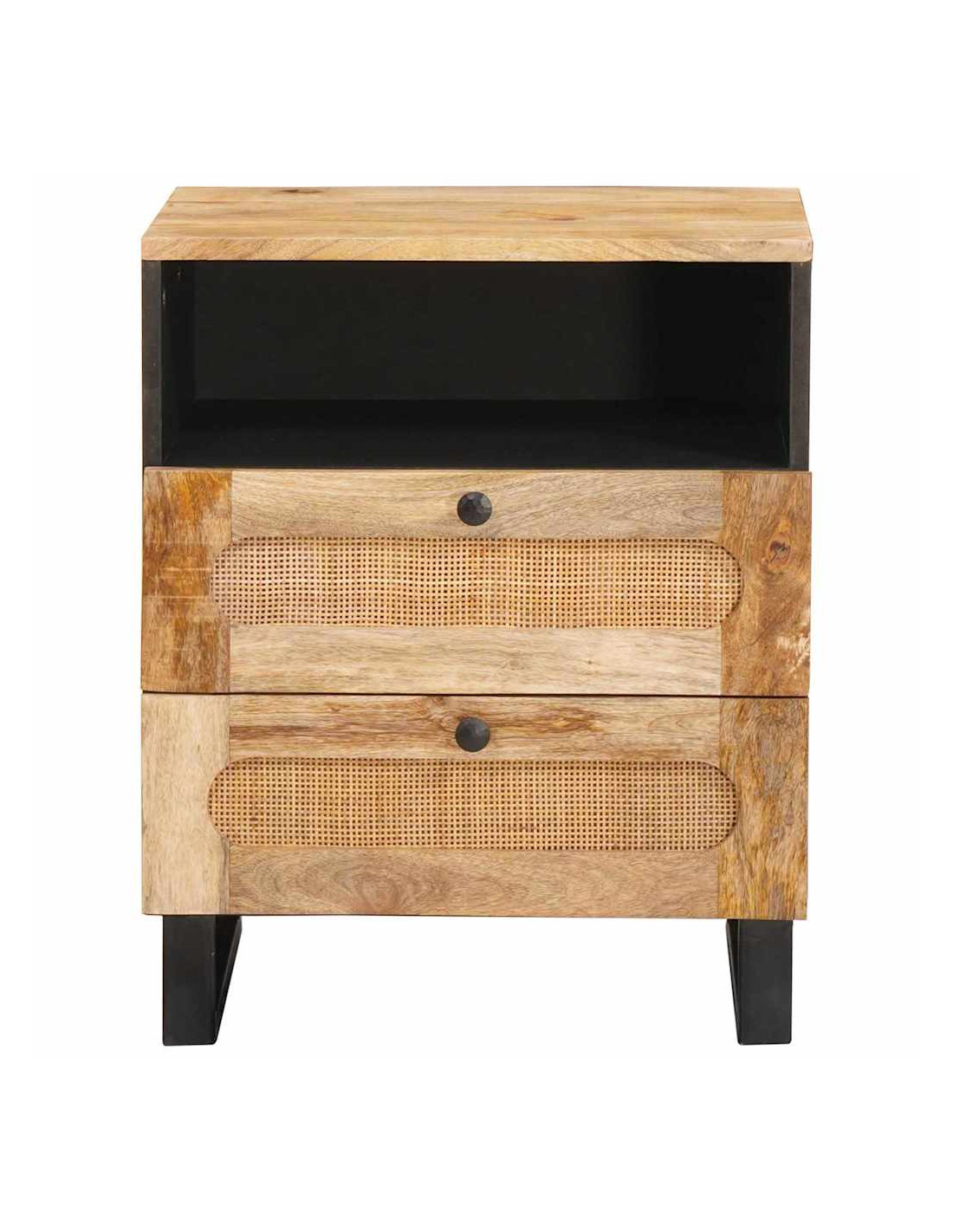Questo comodino è sia pratico che bello. Ha una forma rettangolare e colori caldi di marrone con dettagli neri, che gli danno un aspetto elegante ma non eccessivo. È fatto di legno massello di mango, robusto e perfetto per ogni tipo di arredamento. Puoi metterlo accanto al letto o usarlo come un pezzo distintivo. Oltre ad essere funzionale, si integra alla perfezione con l'arredamento della tua stanza.