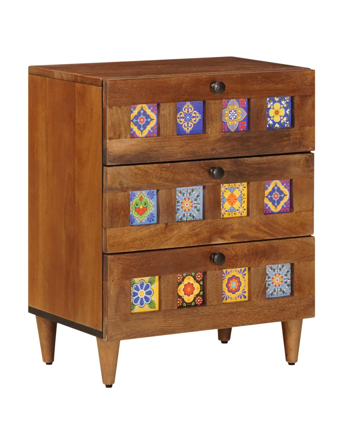 - Costruzione in legno massello di mango: Questo comodino è realizzato in legno massello di mango robusto, che offre una base solida e una bellissima venatura naturale. Il materiale garantisce durata e resistenza, con una calda tonalità marrone che completa ogni stile di arredamento.
