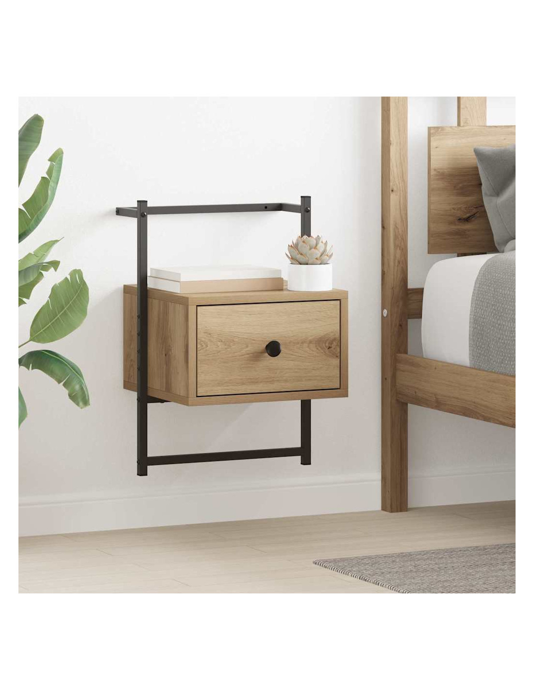 - Superficie in legno ingegnerizzato Questo comodino ha una superficie robusta, ideale per lampade e altri oggetti. Il legno ingegnerizzato garantisce durata e resistenza, mantenendone l'elegante semplicità anche dopo un uso frequente. La finitura a trama naturale completa la struttura in metallo, offrendo un look complessivo molto bello.