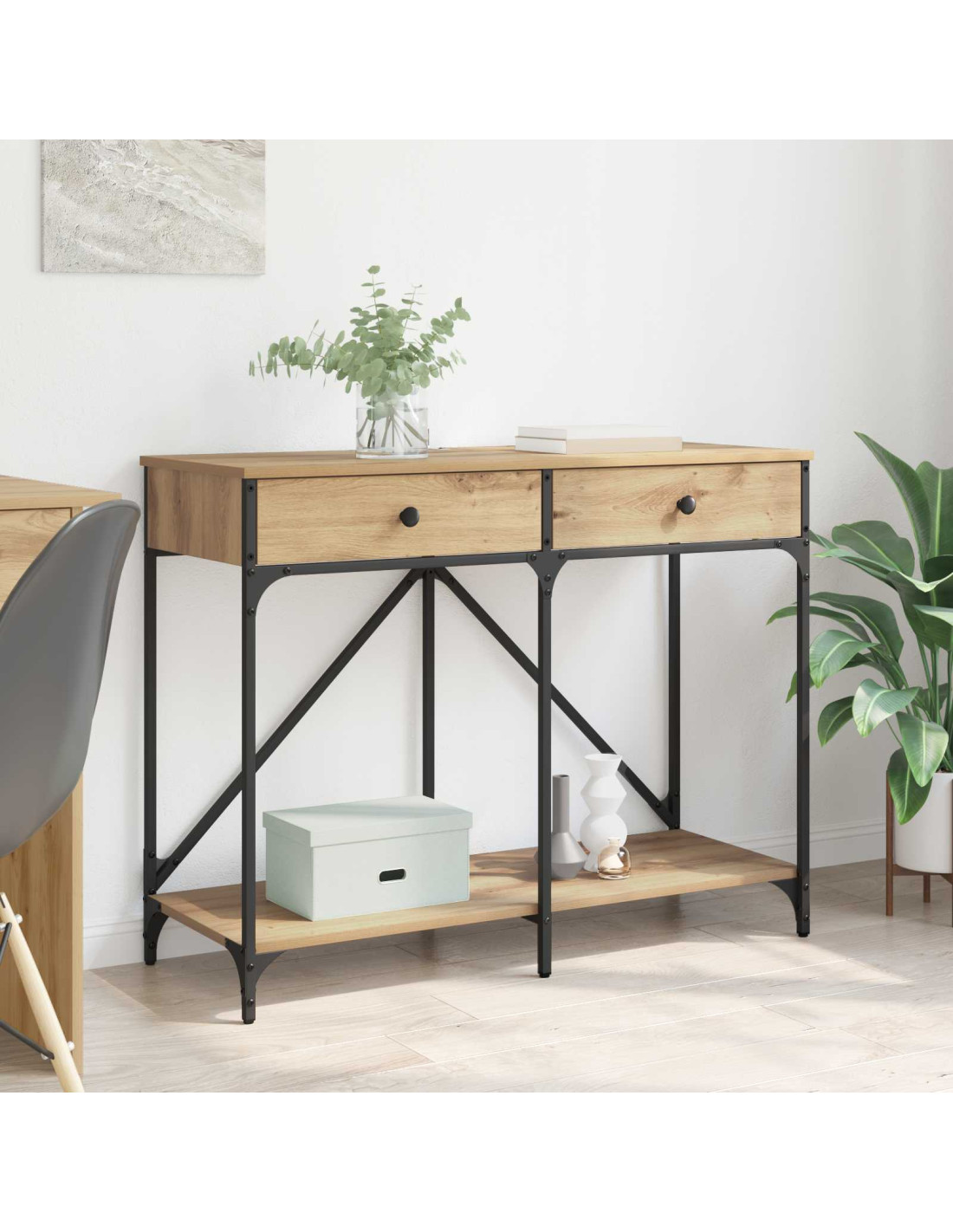 Il tavolo console industriale è un'ottima aggiunta al tuo spazio, unendo rustico e funzionalità moderna. Ideale per chi ama il design naturale e robusto, questo tavolo è un pezzo centrale elegante per qualsiasi stanza. È pensato per dare spazio espositivo e tanto stoccaggio, perfetto per corridoi, ingressi o soggiorni. La sua finitura opaca si adatta a vari stili d'interni, da quelli rustici ai più contemporanei. Perfetto per esporre i tuoi oggetti decorativi preferiti o tenere tutto in ordine, diventa un elemento chiave nella tua decorazione.