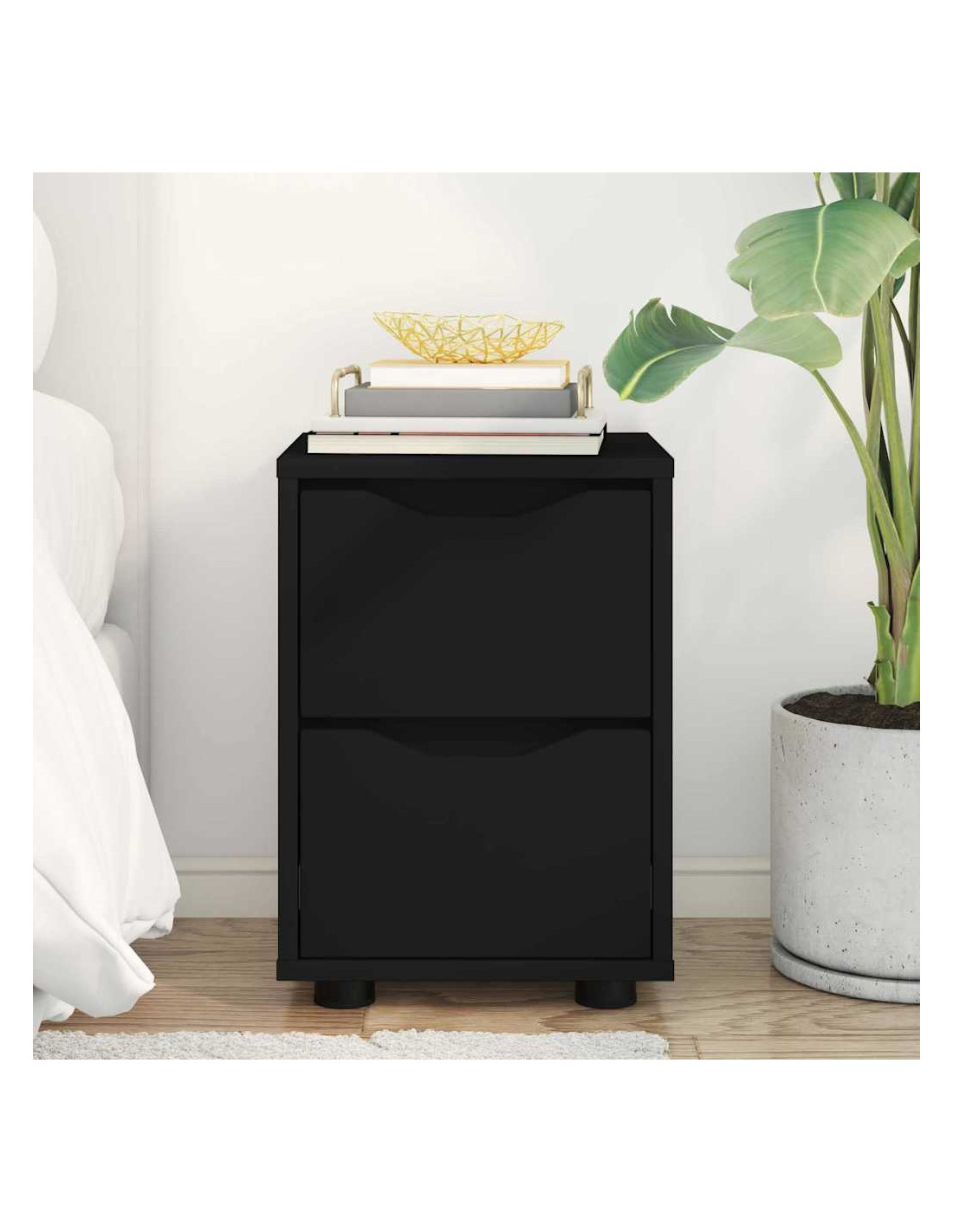 - Materiali: Fatto in legno ingegnerizzato, questo comodino è progettato per durare. È scelto per la sua solidità, rendendolo tanto stabile quanto resistente all'umidità. Questo garantisce che il mobilio mantenga il suo aspetto anche con umidità variabile tipica delle camere da letto.