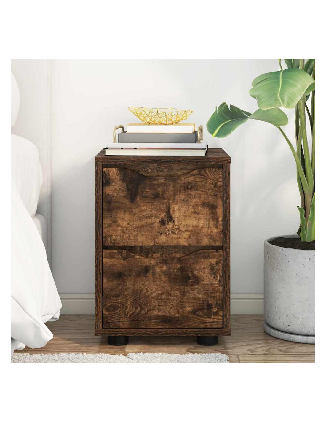 - Materiali: Fatto in legno ingegnerizzato, questo comodino è progettato per durare. È scelto per la sua solidità, rendendolo tanto stabile quanto resistente all'umidità. Questo garantisce che il mobilio mantenga il suo aspetto anche con umidità variabile tipica delle camere da letto.