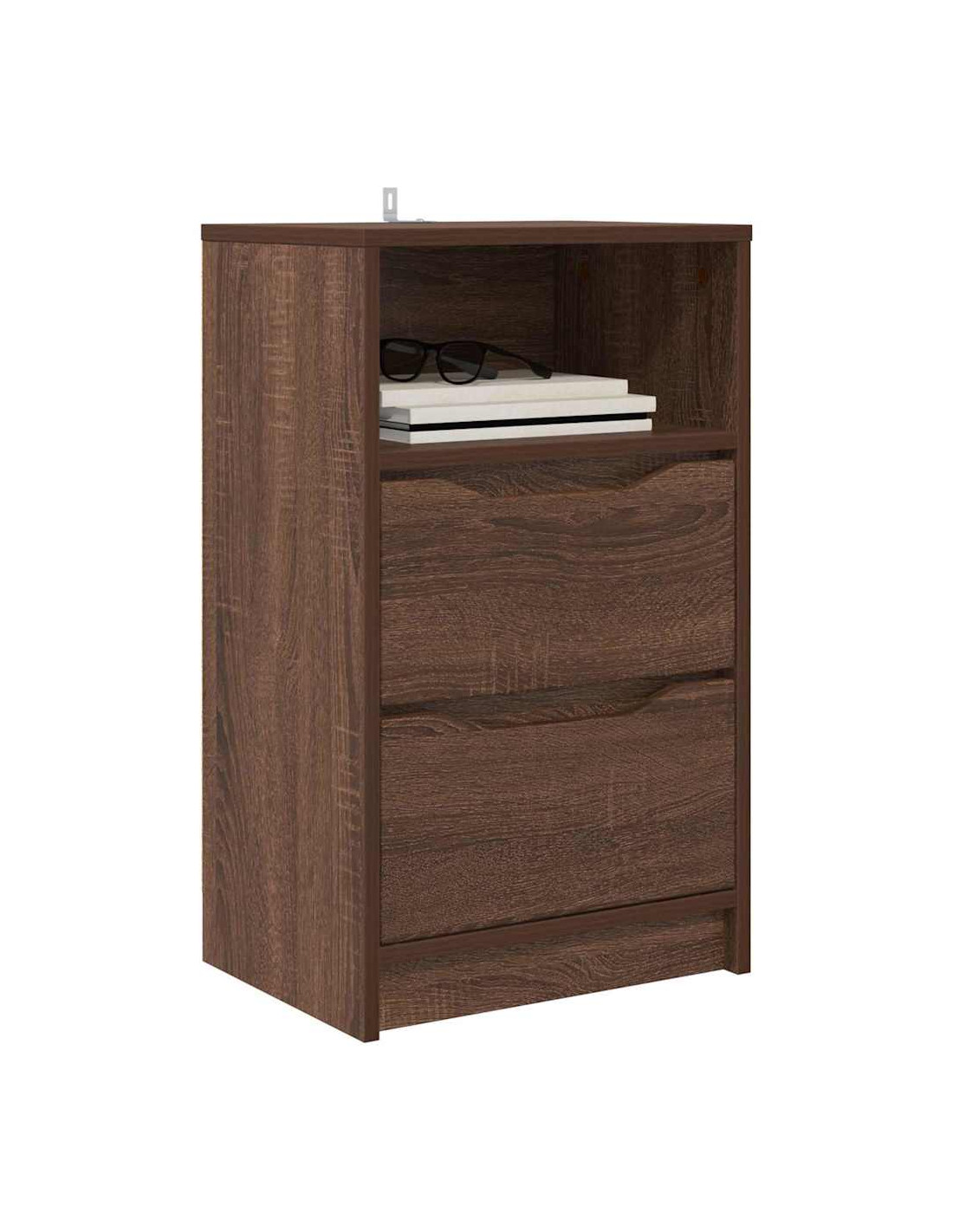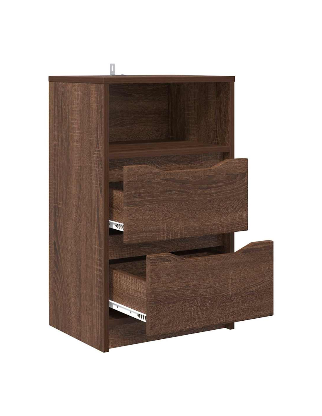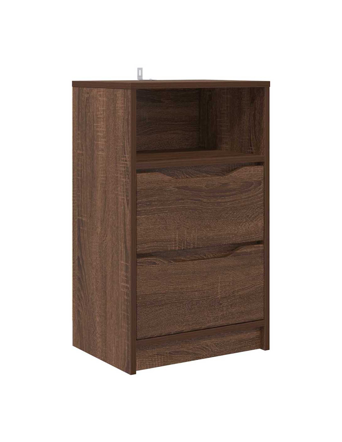 - Legno ingegnerizzato: Il comodino è fatto interamente in legno ingegnerizzato, compresi i cassetti, il retro e la struttura. Questo materiale è robusto e stabile, garantisce che il tavolo regga nel tempo senza deformarsi o rompersi.