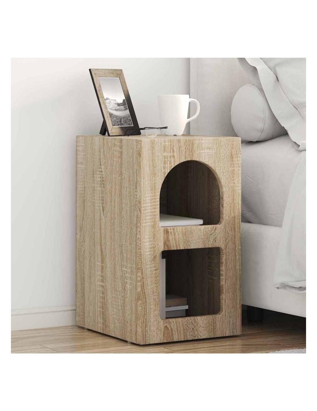 - Costruzione in legno ingegnerizzato: Robusto e resistente all'usura quotidiana, questo comodino mantiene il suo aspetto nel tempo senza aver bisogno di troppa manutenzione, perfetto per lampade e sveglie.