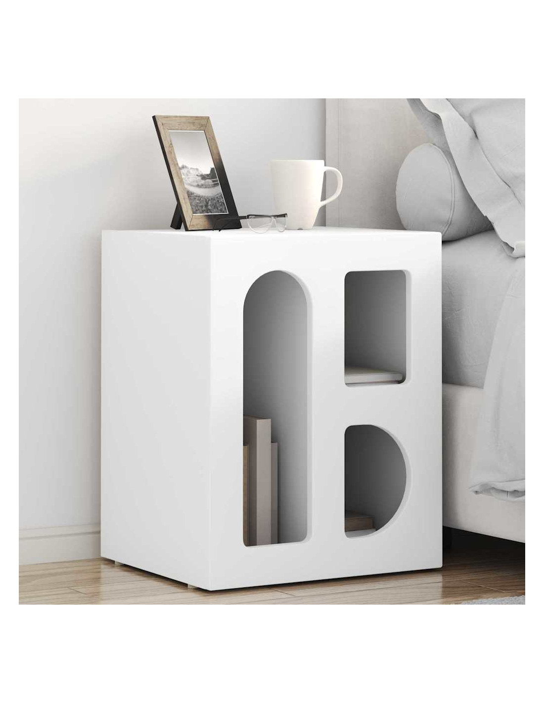 - Legno ingegnerizzato: Questo comodino è fatto di legno ingegnerizzato, il che significa che unisce bellezza e resistenza. Si distingue per la sua consistenza uniforme e la capacità di non deformarsi, assicurando una superficie durevole per l'uso quotidiano. Il suo design moderno rende questo pezzo un'ottima scelta per qualsiasi camera da letto.