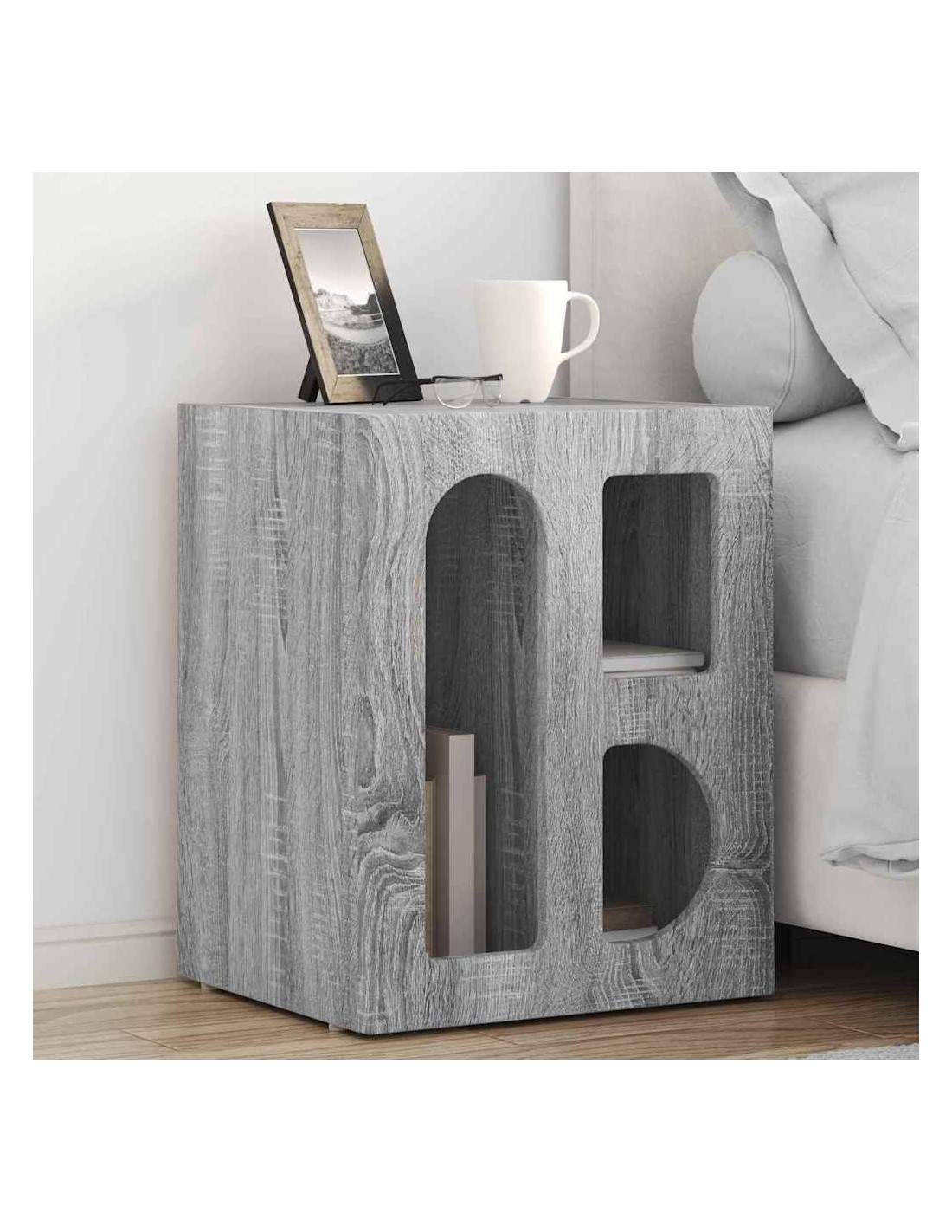 - Legno ingegnerizzato: Questo comodino è fatto di legno ingegnerizzato, il che significa che unisce bellezza e resistenza. Si distingue per la sua consistenza uniforme e la capacità di non deformarsi, assicurando una superficie durevole per l'uso quotidiano. Il suo design moderno rende questo pezzo un'ottima scelta per qualsiasi camera da letto.