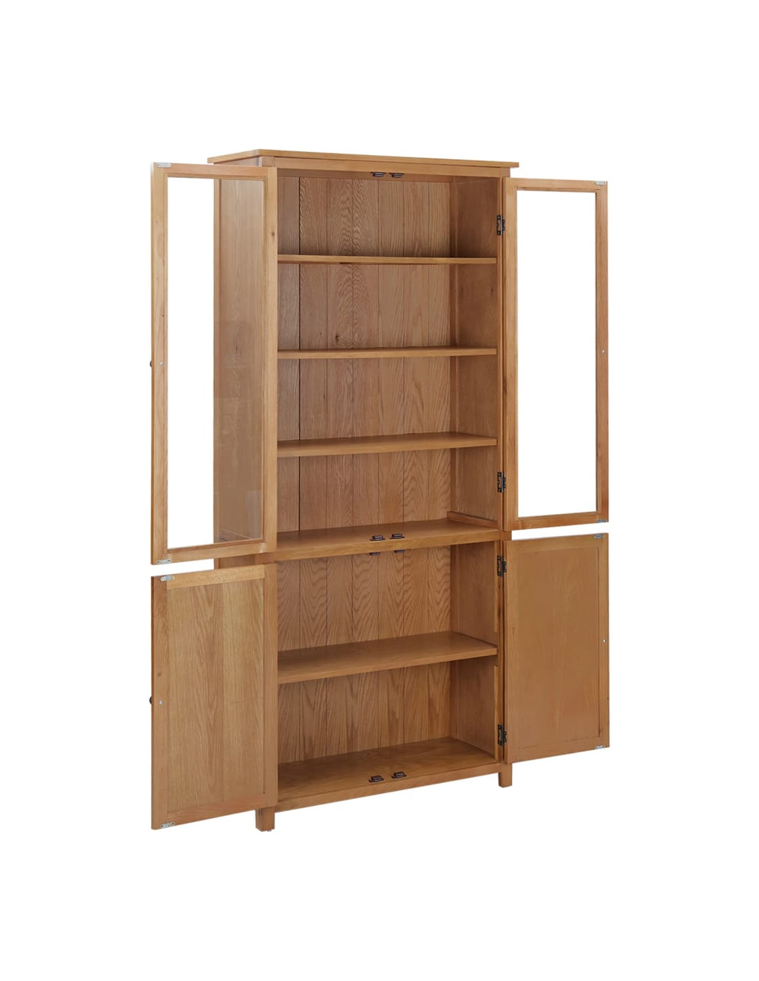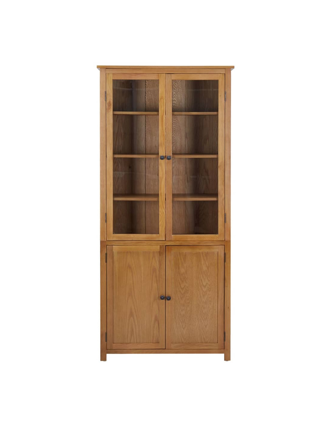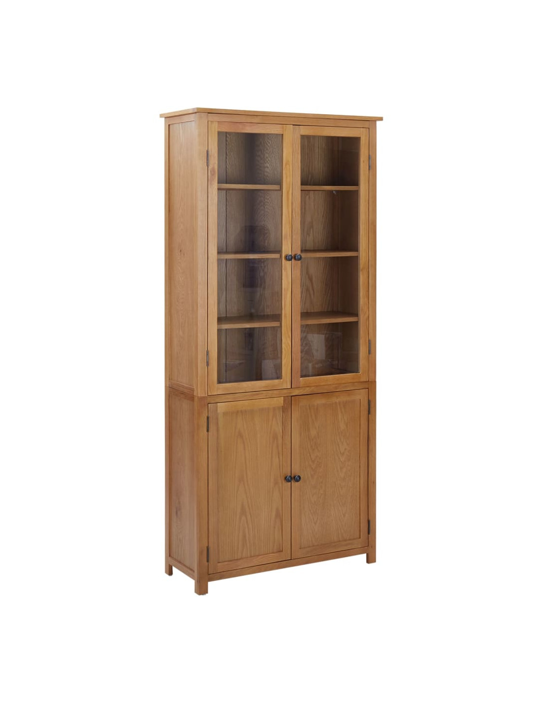 Questa libreria è sapientemente realizzata in legno massello di quercia e MDF, materiali che la rendono resistente e funzionale. È dotata di 3 ripiani dietro due ante in vetro che mettono in mostra i vostri oggetti da collezione, foto incorniciate, piante in vaso, ecc. Potrete anche riporvi contenitori per l'organizzazione, riviste e altro. Invece, nei 2 ripiani inferiori, dietro le due ante di legno, potrete conservare qualsiasi altra cosa da nascondere alla vista.