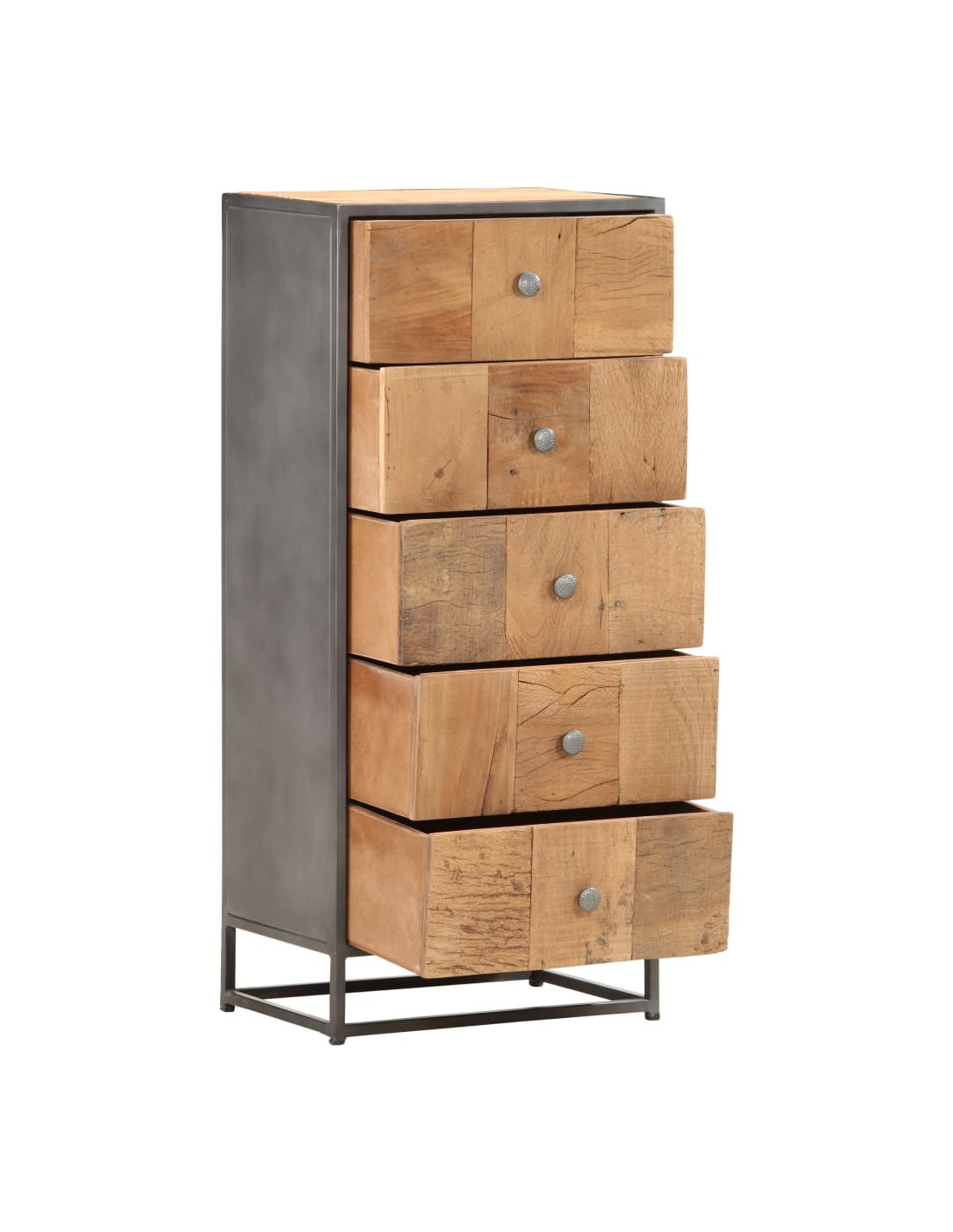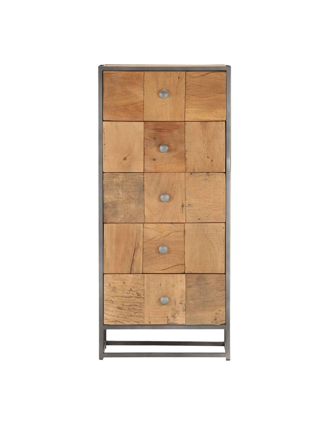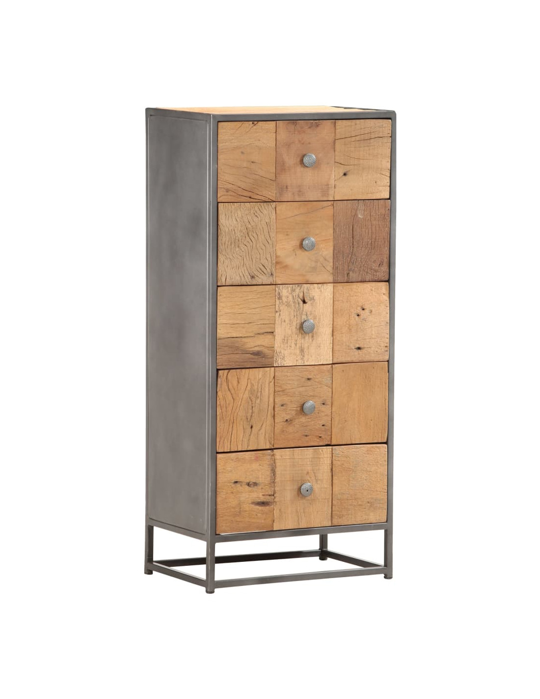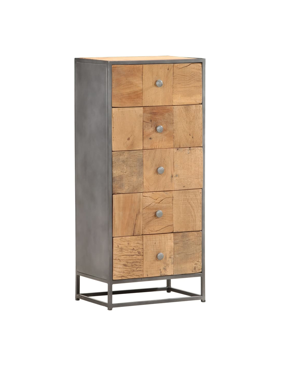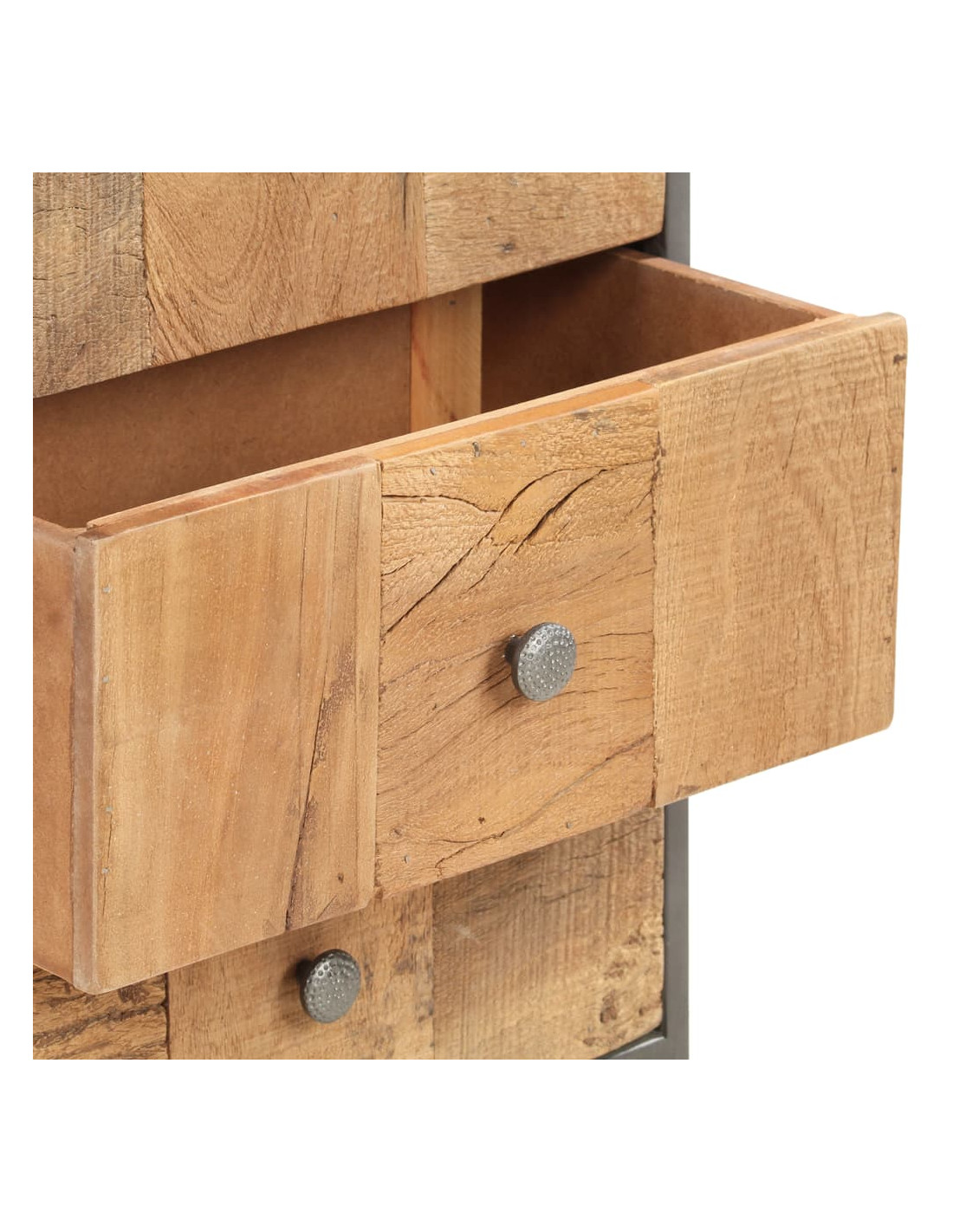Questo armadietto è realizzato in legno di recupero, il che significa che ogni mobile è unico e leggermente diverso dagli altri. I mobili realizzati in legno di recupero hanno caratteristiche di legno diverso, come il legno di teak, l'acacia, il mango, il legno di saal ecc. Il legno di recupero è solido, stabile, resistente e bello. I fori dei chiodi o le venature della superficie chiara portano con sé la loro storia e invitano un'altra generazione ad intrecciarsi con la propria. Mantenere questo mobile a casa mostrerà il vostro concetto di conservazione delle risorse, protezione dell'ambiente e sviluppo sostenibile. Inoltre, il puro lavoro artigianale aggiunge uno stile vintage spettacolare al mobile ed esalta con il suo esotismo. Ogni processo di ricombinazione, lucidatura, verniciatura e ceratura viene elaborato con cura. Il mobile in stile anticato sarà sicuramente un'aggiunta perfetta alla vostra casa!