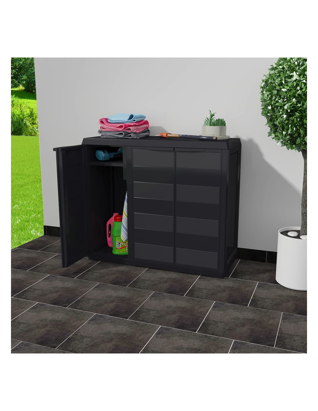 Questo armadietto di alta qualità è ideale per riporre e mantenere in ordine articoli per la casa, attrezzi o altri oggetti nel giardino, nel patio, etc. Grazie al suo design, in stile senza tempo, si adatta perfettamente a qualsiasi ambiente.