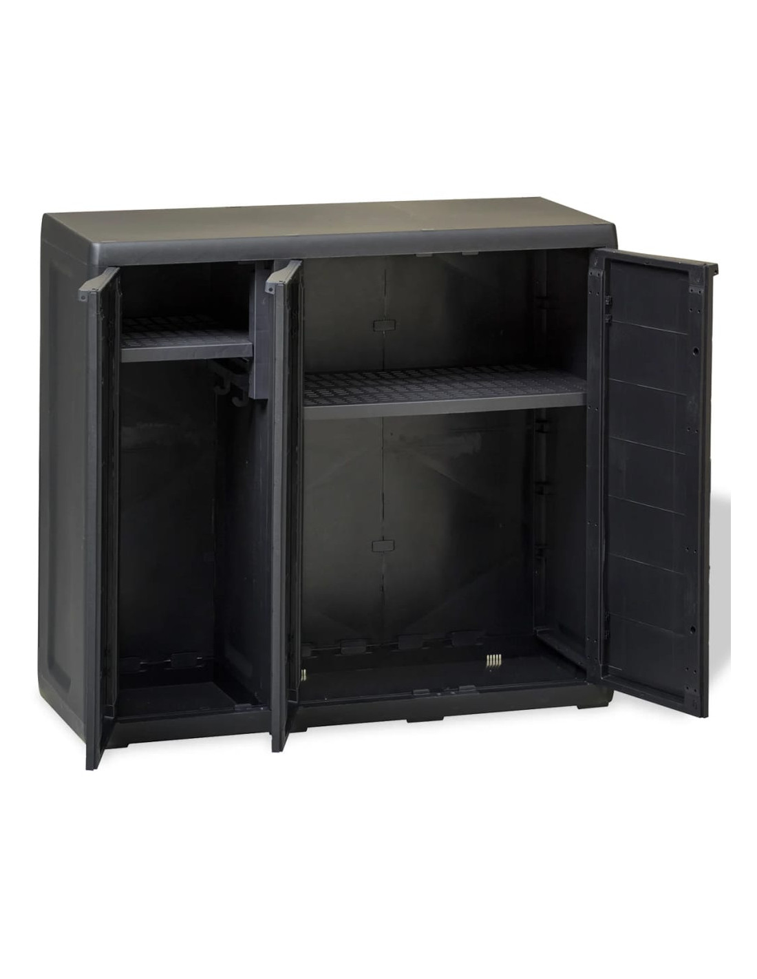 Questo armadietto certificato TÜV-GS è realizzato in robusto e resistente polipropilene (PP). Questo prodotto, molto spazioso, è dotato di ripiani ventilati la cui altezza può essere variata per accogliere oggetti di dimensioni diverse. L'armadietto da giardino può essere chiuso con un lucchetto per una maggiore sicurezza (il lucchetto non è incluso).