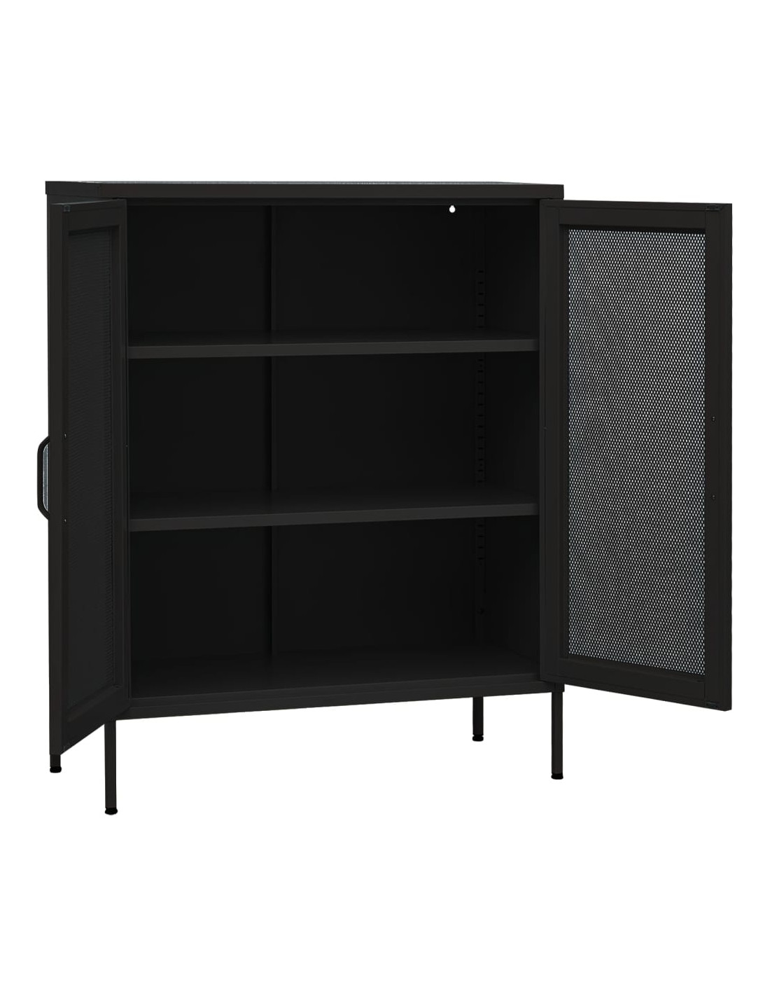 Questo armadietto laterale, caratterizzato da una struttura in acciaio, è robusto e durevole. Sul fondo sono presenti dei livellatori per regolare l'altezza in base alle proprie esigenze. La credenza ha 2 ante in rete con ripiani regolabili all'interno per adattarsi a oggetti di diverse dimensioni, come libri, riviste e altri oggetti personali.