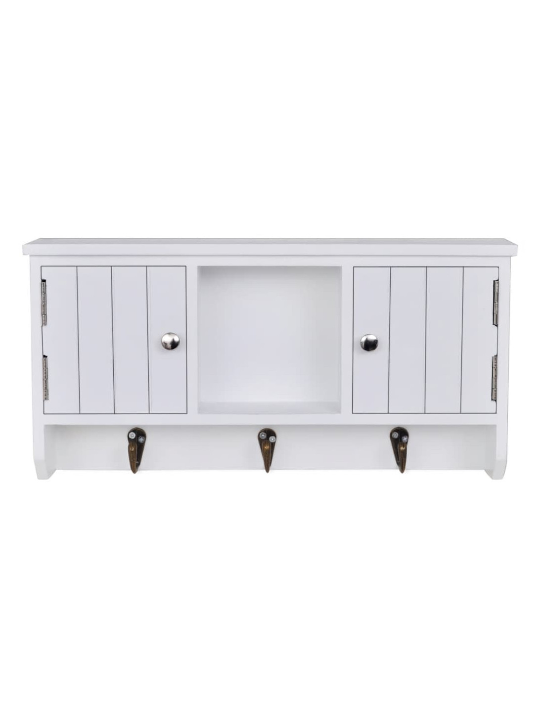 L'armadietto ha tre ganci in metallo per le chiavi. I due vani con ante ed il ripiano in mezzo offrono tanto spazio per stoccare portafogli, telefoni cellulari, occhiali da sole, gioielli o altri accessori.