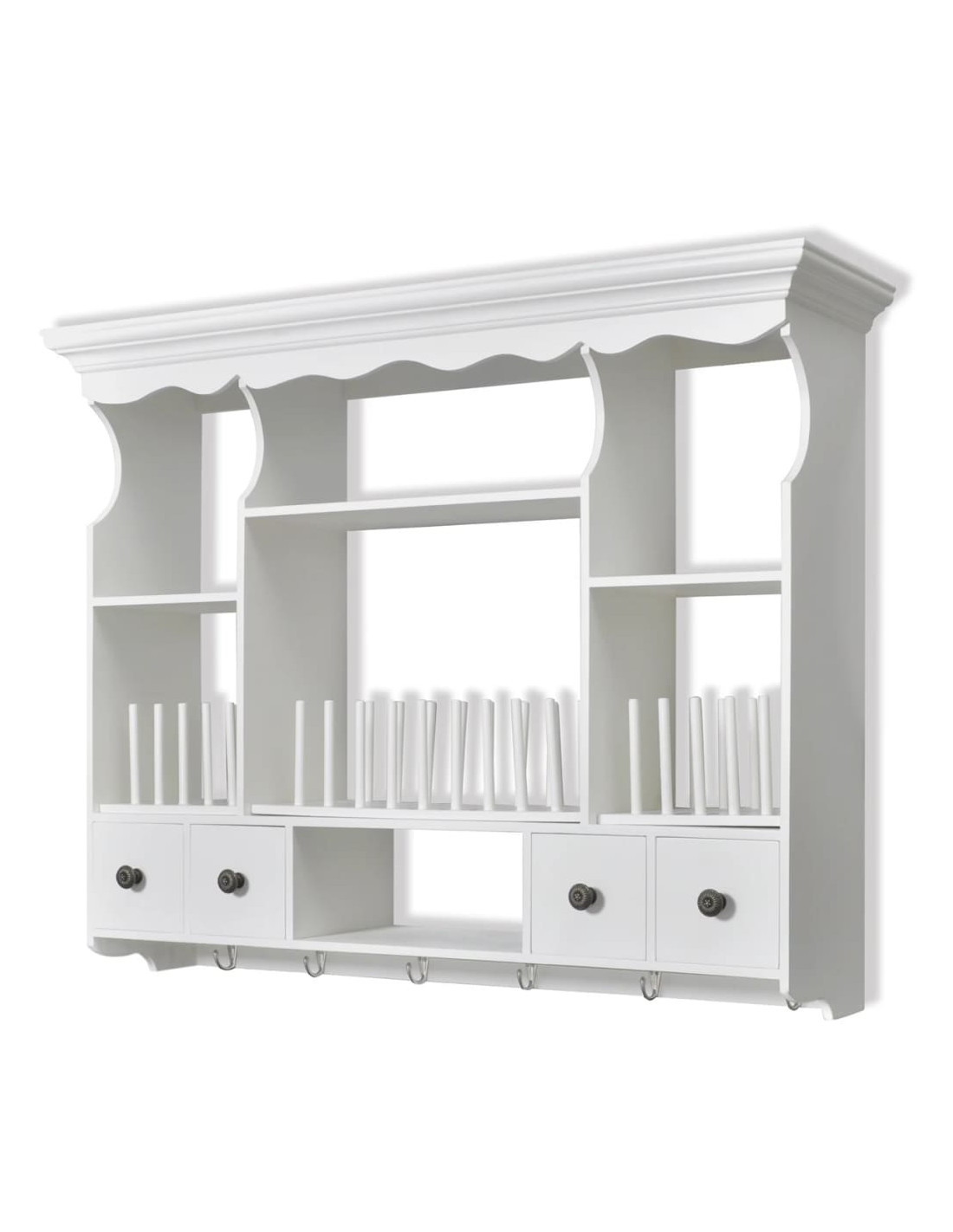 Il mobile è dotato di quattro cassetti e quattro ripiani, che consentono di riporre facilmente cereali, spezie, snack, prodotti in scatola e molto altro ancora. I pioli mantengono piatti e stoviglie in posizione. I cassetti si aprono facilmente, così potete prendere rapidamente le cose di cui avete bisogno. E' dotato di ganci, per appendere tazze o asciugamani.