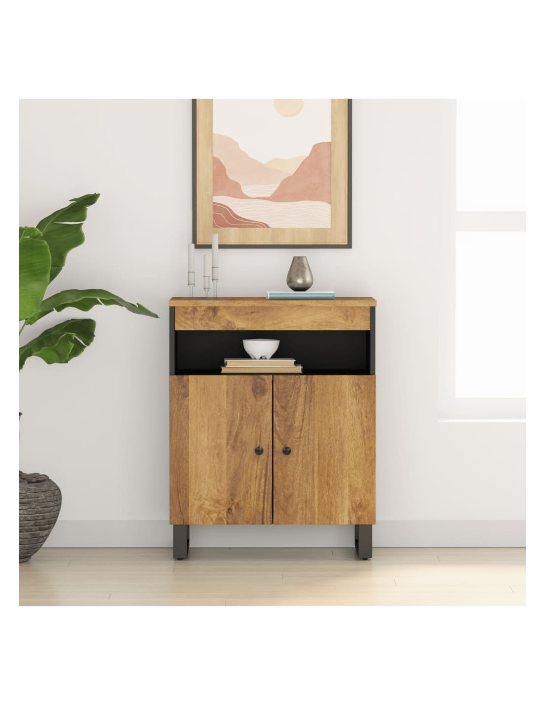 - Legno massello di mango: Questo mobiletto è realizzato in legno massello di mango, un legno duro con venature dense. Il legno massello di mango non solo è in grado di sopportare grandi pesi, ma è anche resistente all'usura del tempo.