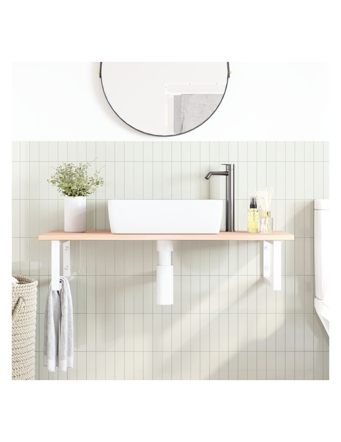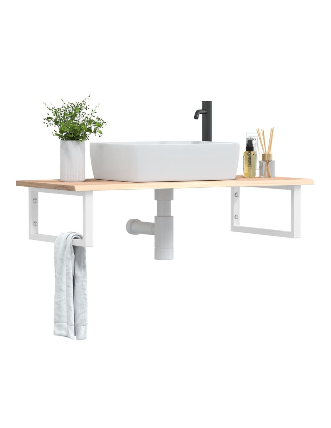 Il ripiano per lavabo a parete si fissa saldamente alla parete, offrendo una soluzione elegante e salvaspazio per il vostro bagno. Robusto e duraturo: questo ripiano per lavabo è combinato con una struttura in acciaio e un piano in legno massello di rovere, che lo rendono robusto, stabile e duraturo.Salvaspazio: il ripiano lavabo sospeso ha ampio spazio per riporre creme e piccoli oggetti. Grazie alla forma rettangolare, potete appendere asciugamani o altro sul supporto per risparmiare spazio.Facile da usare: il piano di lavoro non è forato per consentire il montaggio del lavabo a sinistra, a destra o al centro, a seconda delle esigenze della stanza. Grazie ai fori predisposti nel supporto, può essere facilmente assemblato con il piano e montato a parete.Ampie applicazioni: grazie al suo design moderno, offre spazio aggiuntivo per vari tipi di bagni. Buono a sapersi:Le viti non sono incluse, è possibile acquistarle separatamente in base alle informazioni fornite di seguito.Fissaggio a parete: 2 viti di espansione M8 per staffaPiano in legno: 2 viti M5x18 (T=2) o 2 viti M5x20 (T=2,5/4cm) per staffaEssendo un prodotto naturale, il legno può presentare nodi e imperfezioni che riempiamo con riempimenti neri per garantire un aspetto liscio.